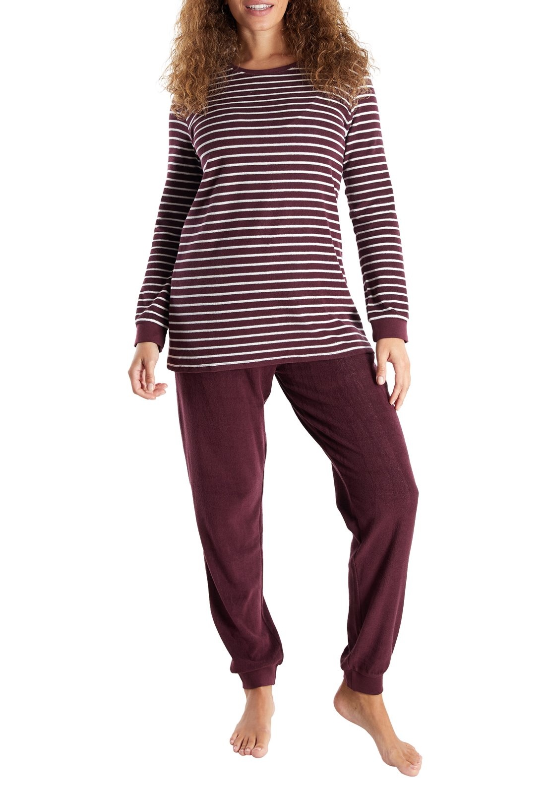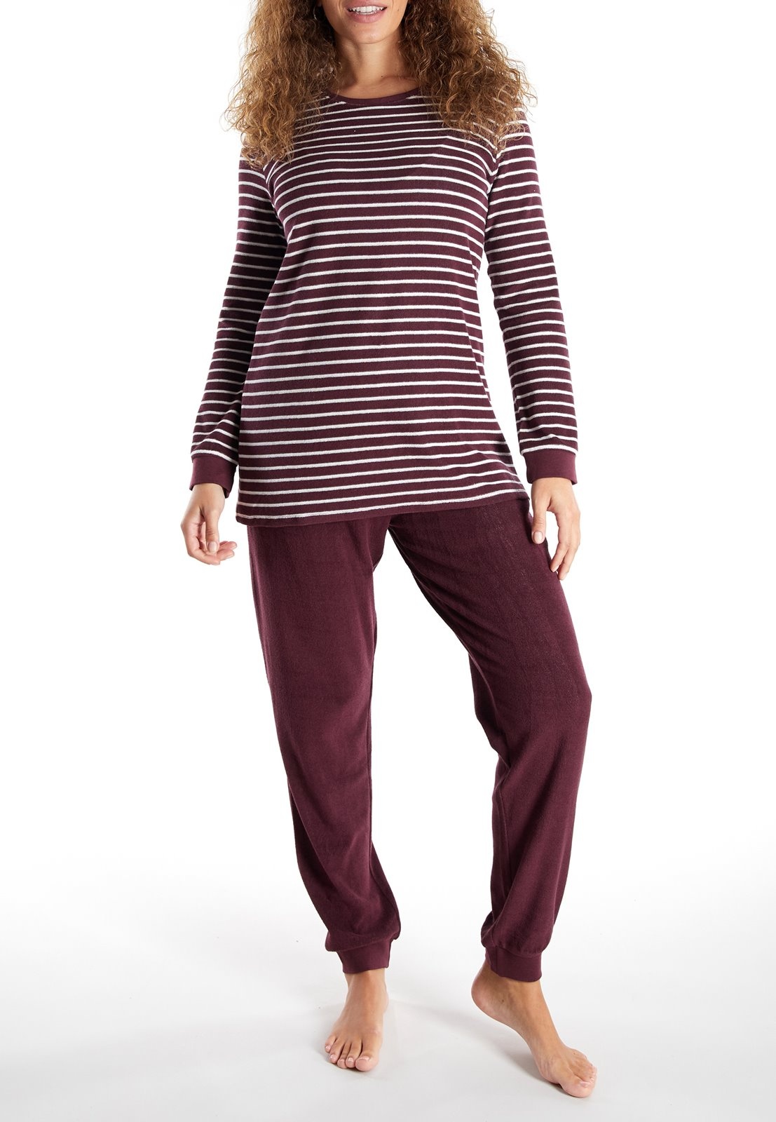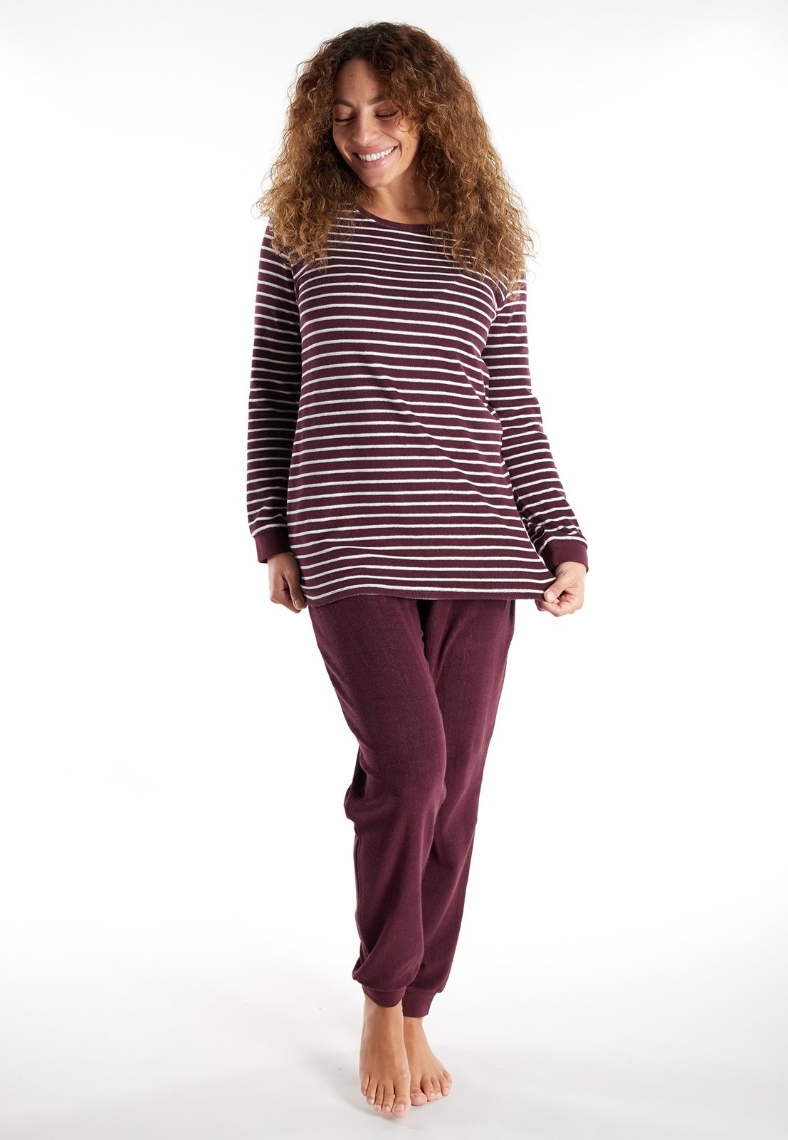 Deze warme badstof dames pyjama van Götzburg combineert comfort, kwaliteit en een stijlvolle uitstraling. Het pyjamashirt is uitgevoerd in een gestreept dessin in een diepe bordeauxrode kleur, terwijl de broek effen is gehouden voor een rustige en elegante look. Dankzij de ronde hals en de boorden aan mouwen en broekspijpen zit deze pyjama altijd comfortabel en blijft hij goed op zijn plaats tijdens het slapen.