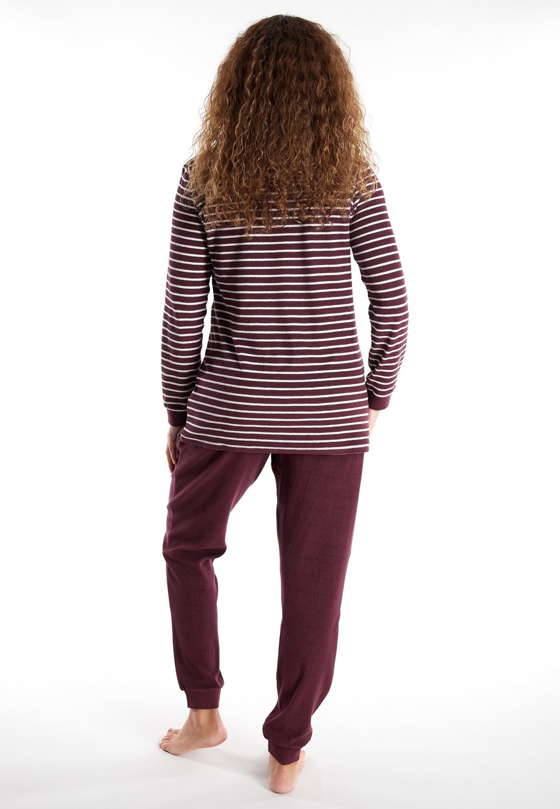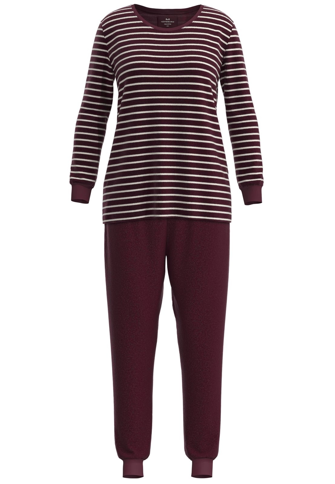 Warme badstof dames pyjama van het merk Götzburg. De pyjama heeft een gestreept dessin in een mooie bordeaux rode kleur. Lees meer