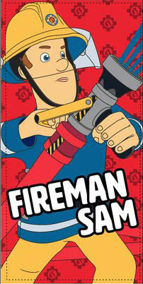 Brandweerman Sam Strandlaken. Op het Strandlaken staat Brandweerman Sam met een brandweerslang.