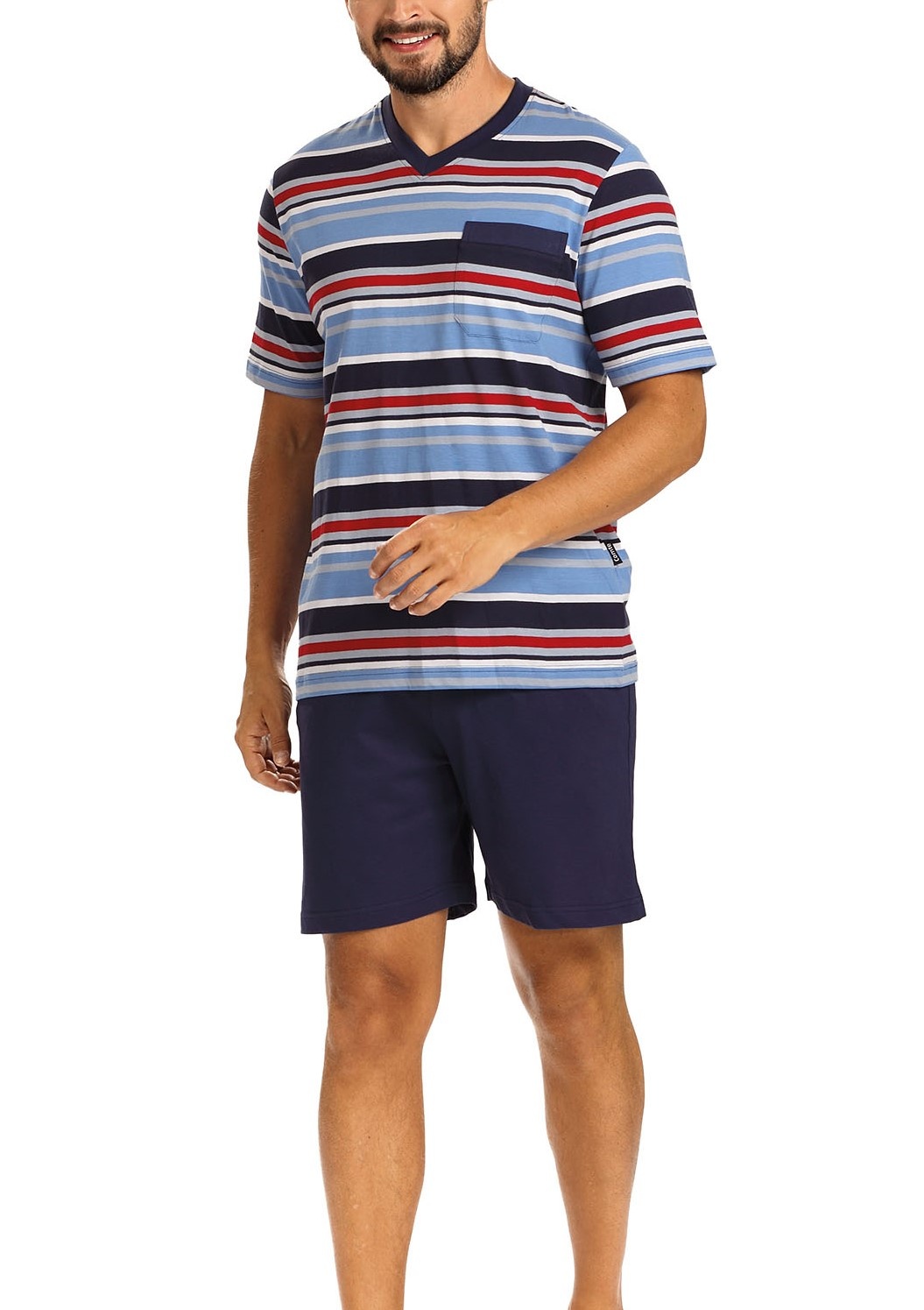 Korte heren pyjama heeft een gestreept dessin. Shirt met v-hals en heeft een borstzak.