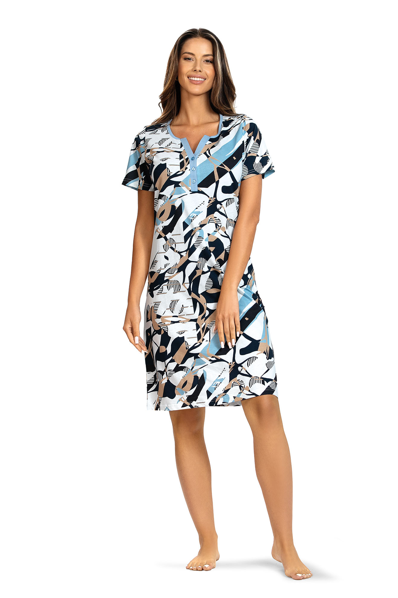 Het nachthemd heeft een speels en eigentijds all-over dessin in blauw, beige en zwarttinten, wat zorgt voor een frisse en modieuze look. De ronde hals met knoopsluiting geeft het model een verzorgde en vrouwelijke uitstraling. Dankzij de korte mouwen is dit nachthemd ideaal voor het voorjaar en de zomer.