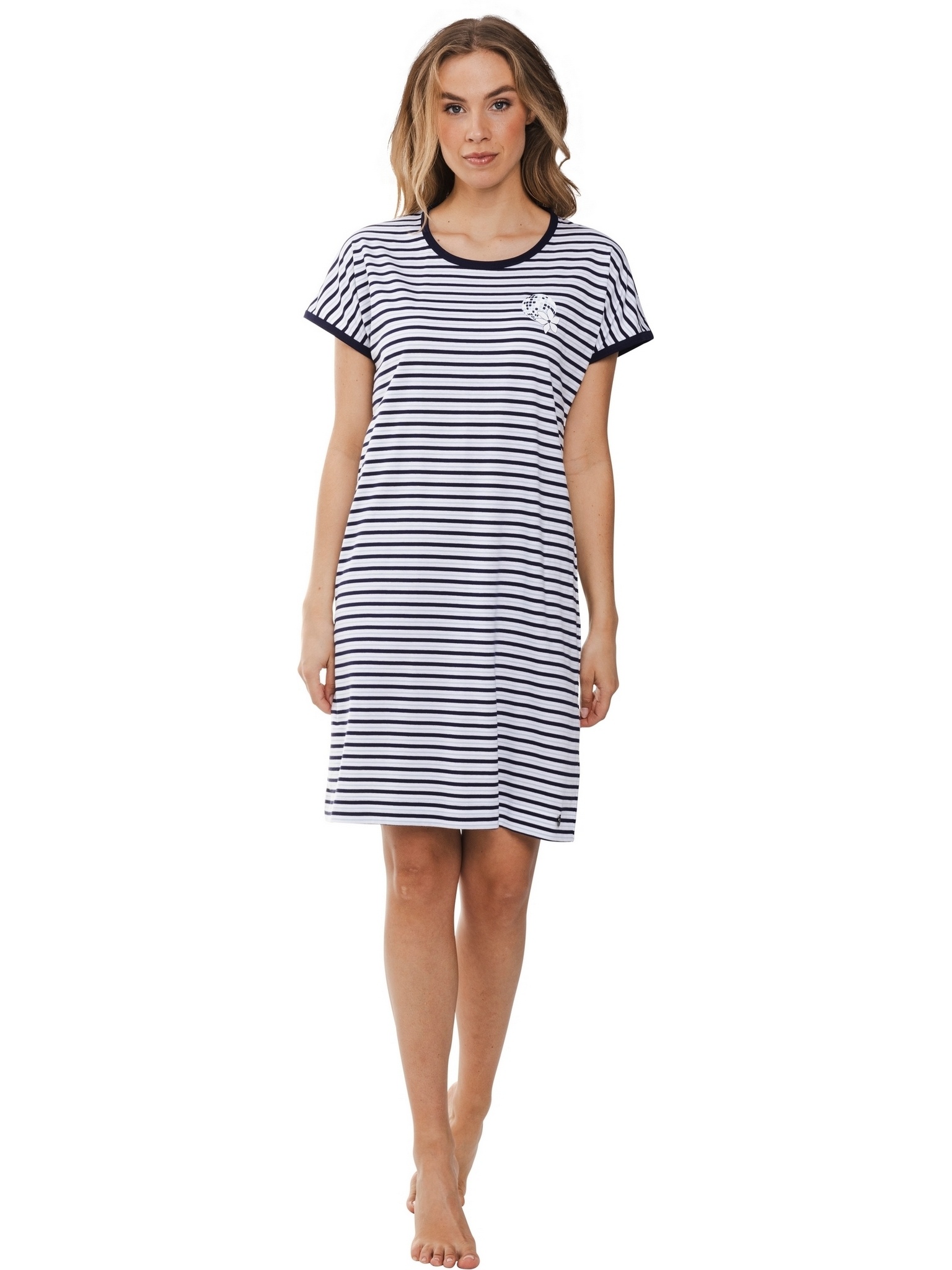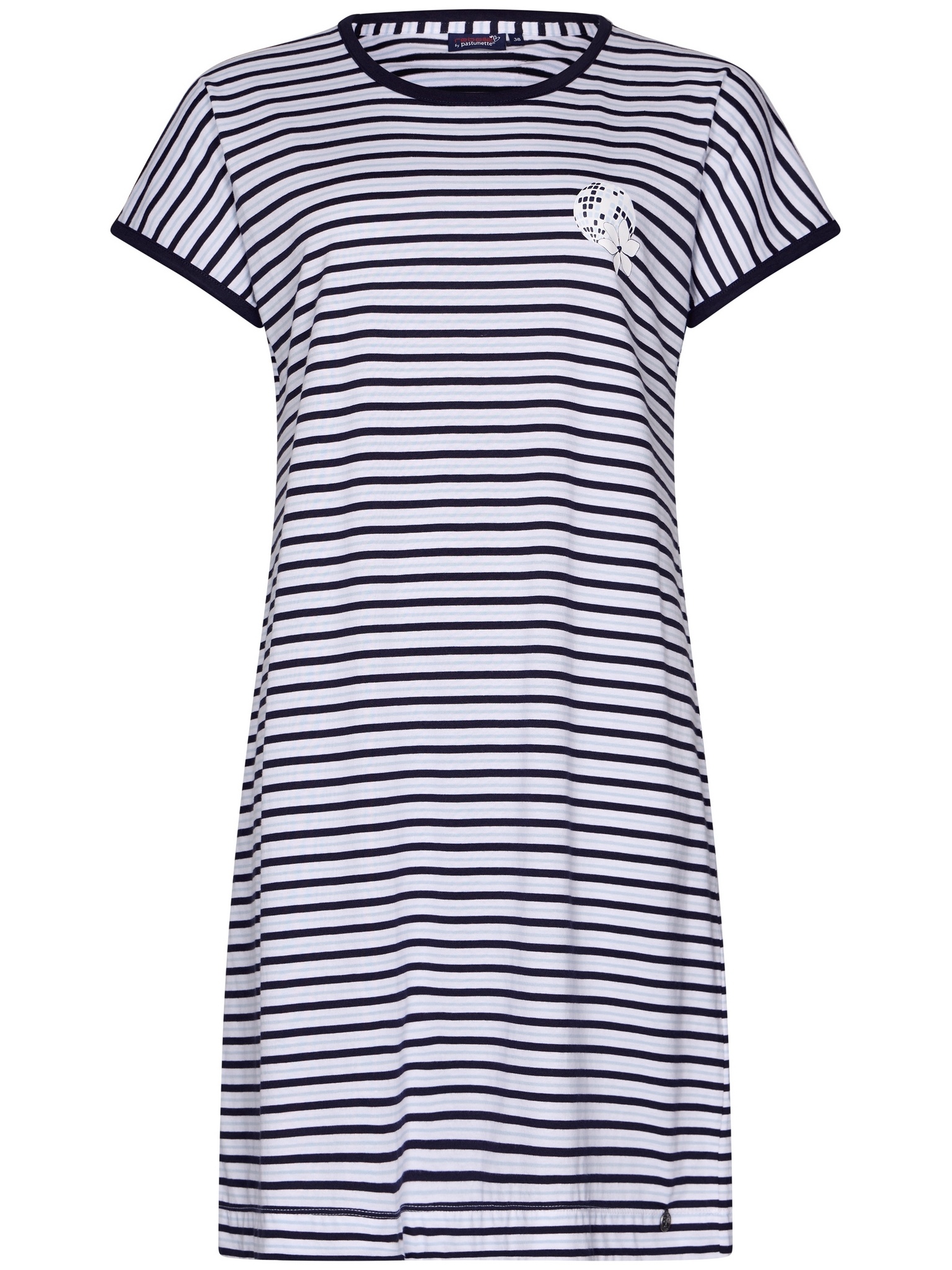 Het nachthemd is wit van kleur en heeft een frisse combinatie van lichtblauwe en donkerblauwe strepen. De print met een wit bloemetje en discobal geeft het nachthemd een speelse en vrolijke uitstraling. Het nachthemd heeft korte mouwen en een ronde hals, met als leuk detail de donkerblauwe stiksels langs de hals en mouwen.