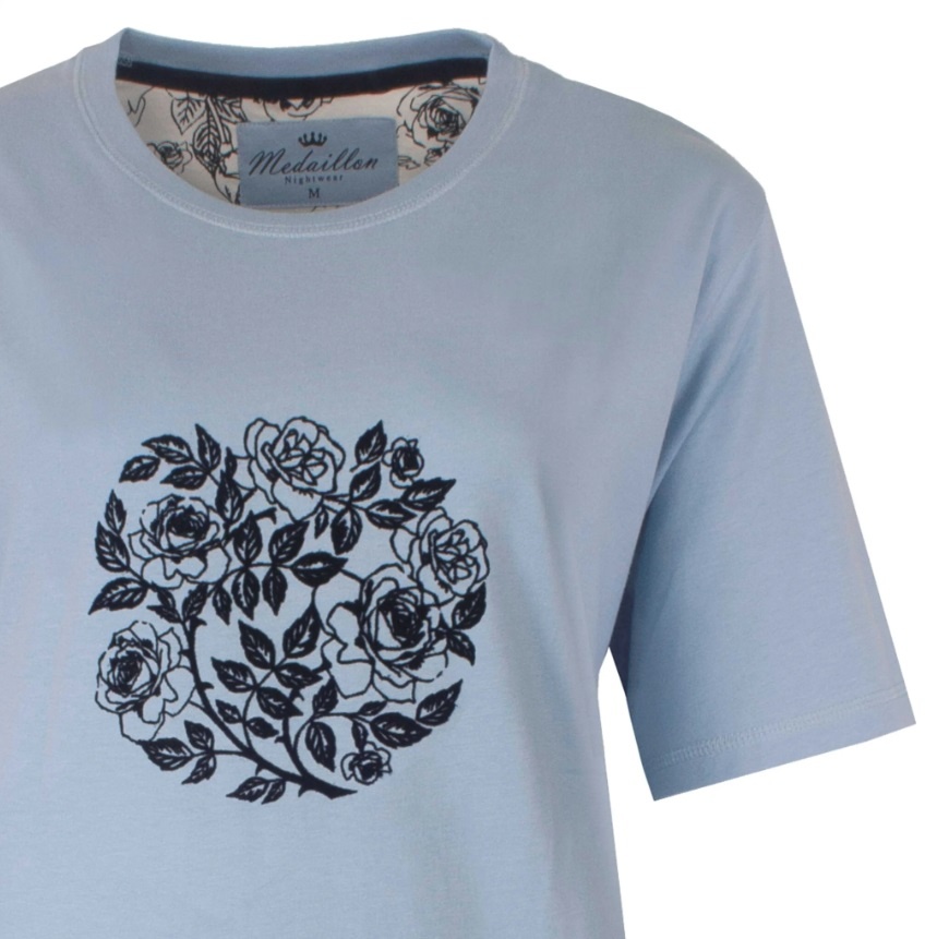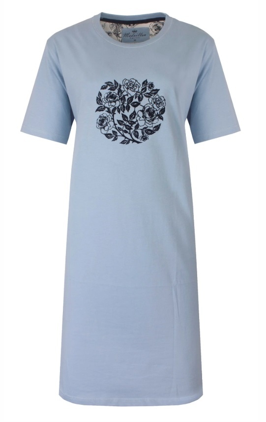 Medaillon Dames Nachthemd gemaakt van 100 % gekamde Katoen. Dit nachthemd is gemaakt in een draagbare en rekbare jersey kwaliteit. Het nachthemd is in een unie blauwe kleur. Dit nachthemd heeft een ronde hals afgewerkt met unie rekbaar biesje. Op de borst een geprint dessin. Splitjes in de zijnaad. Korte mouwen.