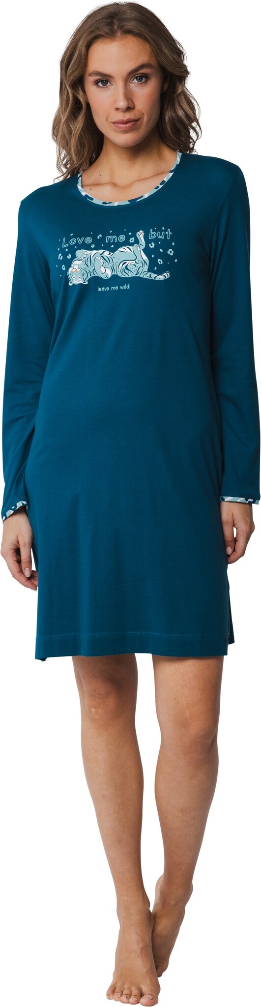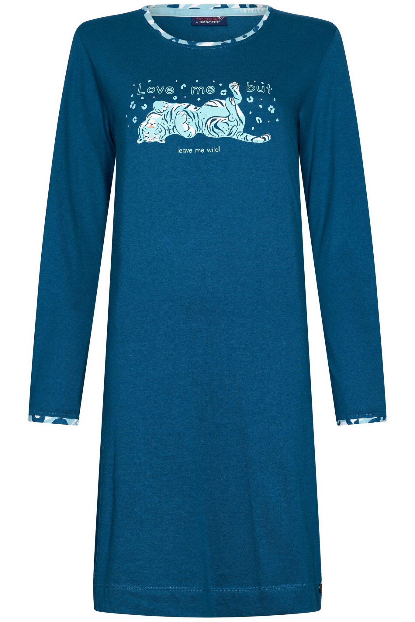 Dames nachtemd van Rebelle. Nachthemd heeft een mooie blauw groene kleur (turquoise) met op de borst een stoere print.