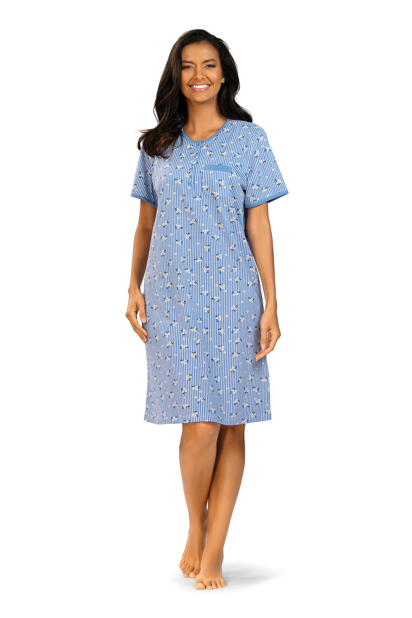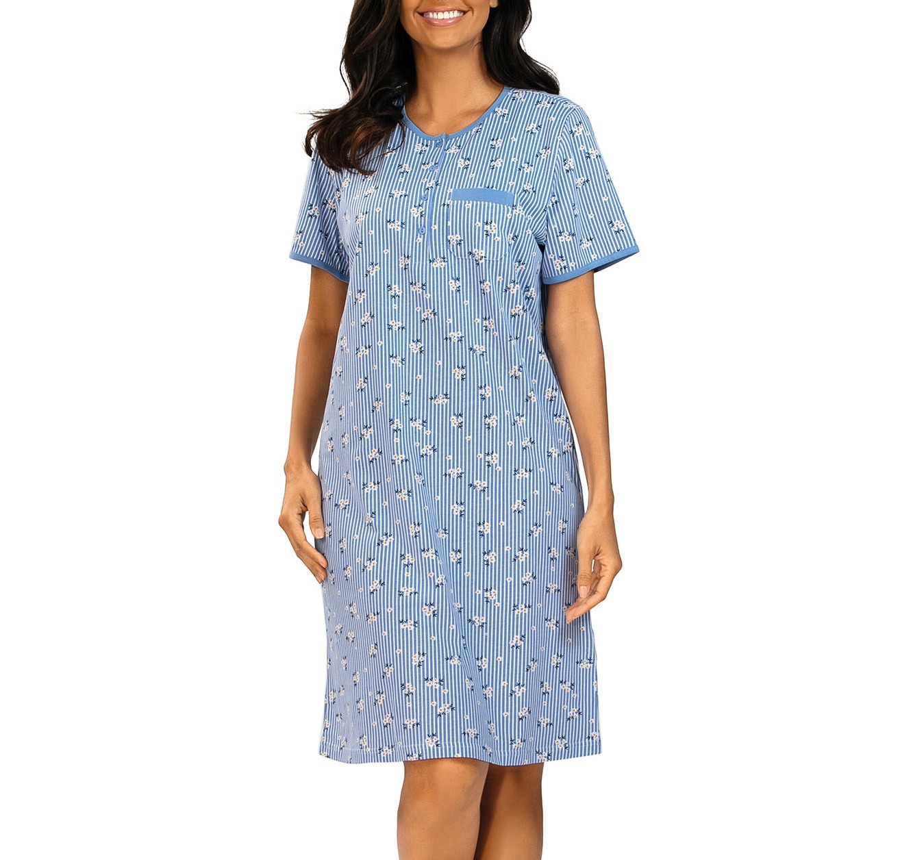 Het model is uitgevoerd in een zachte blauwe kleur met een subtiel streepdessin en kleine bloemetjes, wat zorgt voor een frisse en vrouwelijke uitstraling. De ronde hals is voorzien van een knoopsluiting met 3 knoopjes en een bijpassende bies. Daarnaast heeft het nachthemd een praktisch borstzakje, wat het geheel een verzorgde look geeft. De korte mouwen maken dit nachthemd perfect voor het voorjaar en de zomer.