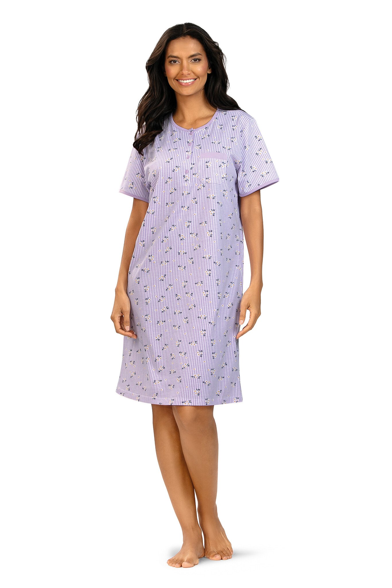 Het model is uitgevoerd in een zachte paarse kleur met een subtiel streepdessin en kleine bloemetjes, wat zorgt voor een frisse en vrouwelijke uitstraling. De ronde hals is voorzien van een knoopsluiting met 3 knoopjes en een bijpassende bies. Daarnaast heeft het nachthemd een praktisch borstzakje, wat het geheel een verzorgde look geeft. De korte mouwen maken dit nachthemd perfect voor het voorjaar en de zomer.