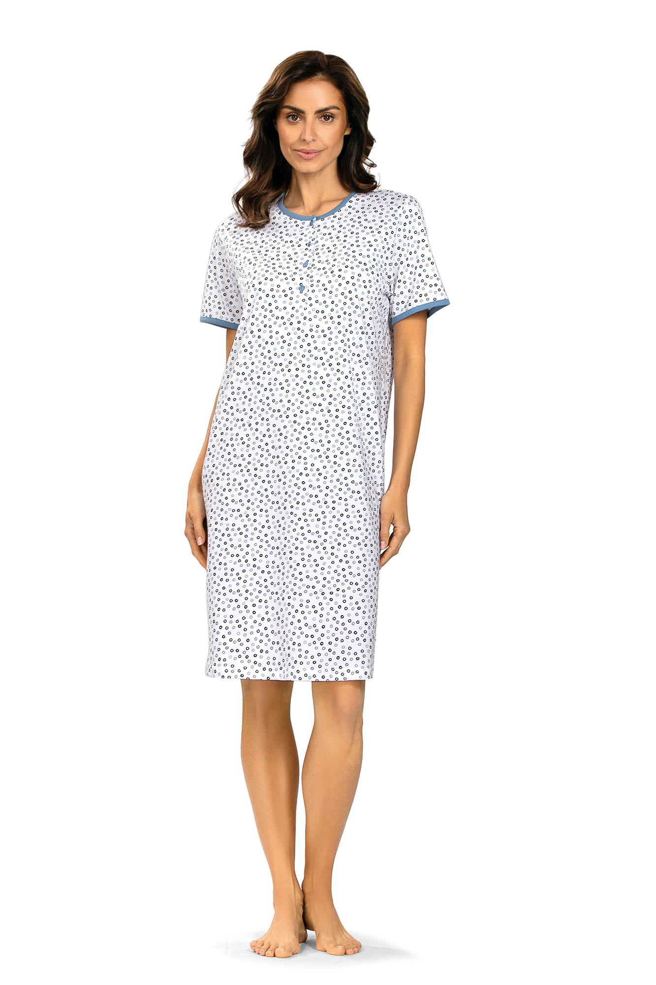 Dames nachthemd van Comtessa in een katoenen kwaliteit. Mooi zomers dessin. Het nachthemd heeft een ronde hals met 4 knoopjes.