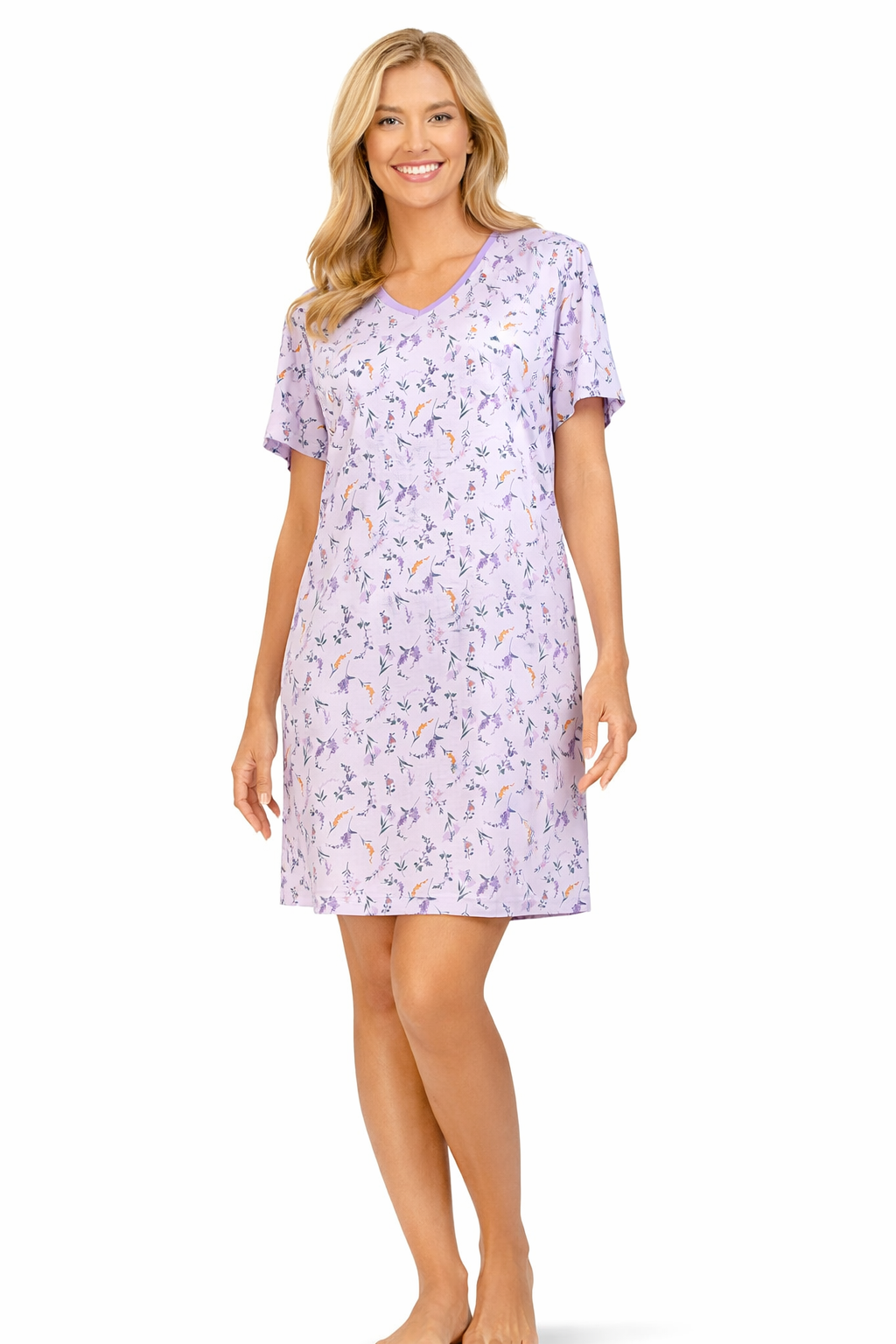 Het nachthemd is uitgevoerd in een zachte mauve kleur en heeft een zomers dessin met subtiele bloemetjes, wat zorgt voor een frisse en vrouwelijke uitstraling. Het model is voorzien van korte mouwen en een comfortabele ronde hals, waardoor het heerlijk draagt tijdens warmere dagen en nachten.