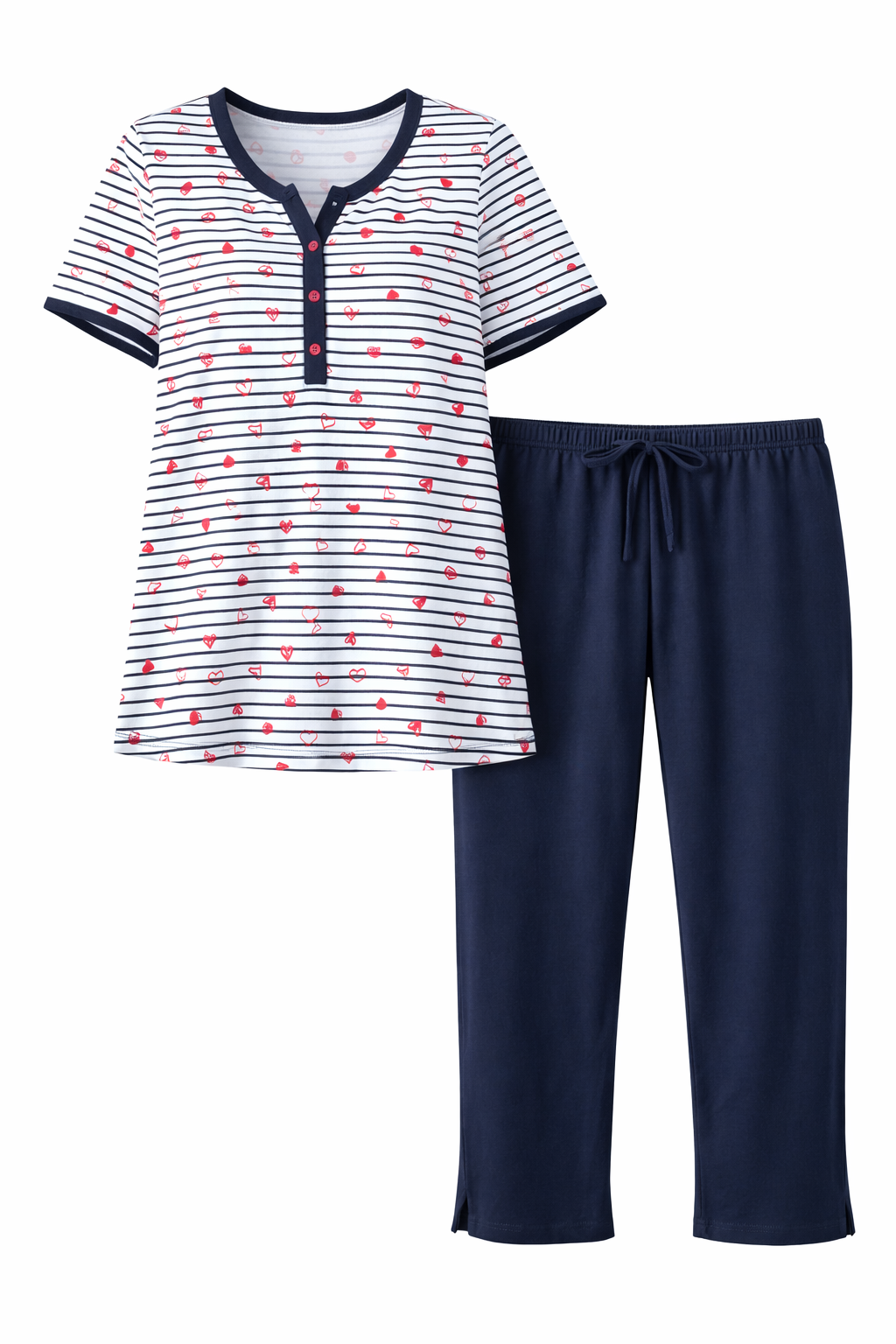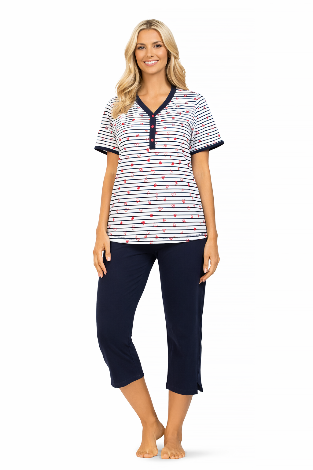 De top heeft een speels streepdessin in wit en donkerblauw, verrijkt met kleine rode hartjes en ankertjes, wat zorgt voor een frisse, maritieme en vrouwelijke uitstraling. De top is voorzien van korte mouwen en een comfortabele ronde hals met knoopsluiting. De donkerblauwe afwerking aan de hals en mouwen geeft het geheel een sportieve en verzorgde look.