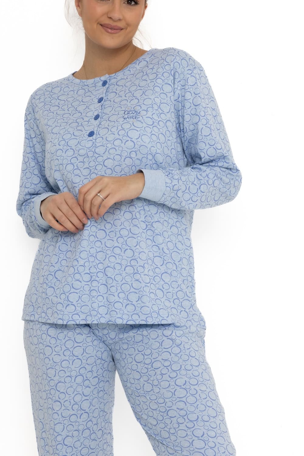 Deze damespyjama van Cocodream is de ideale keuze voor wie comfort, warmte en een stijlvol design wil combineren tijdens de koude maanden. De pyjamaset is uitgevoerd in een mooie blauwe kleur met een speels all-over patroon dat zorgt voor een frisse en moderne uitstraling. De top heeft lange mouwen, een ronde halslijn en een praktische knoopsluiting met 4 knoopjes. Zowel de mouwen als de broekspijpen zijn afgewerkt met zachte boorden, zodat de pyjama altijd goed blijft zitten en extra draagcomfort biedt.