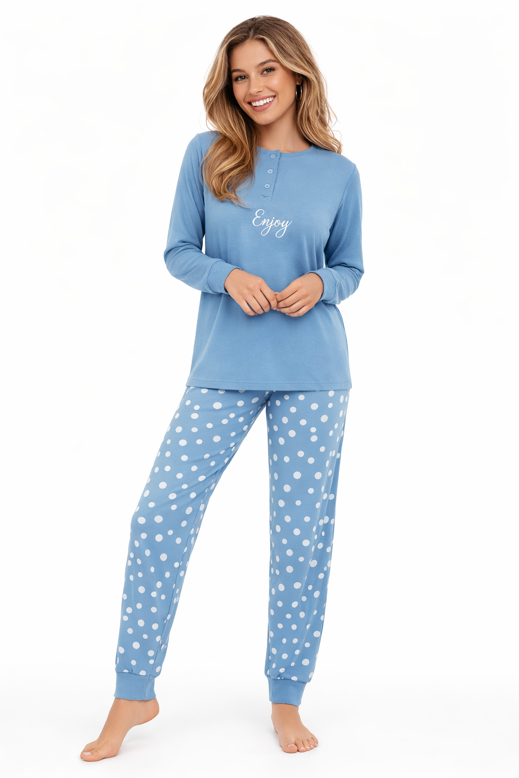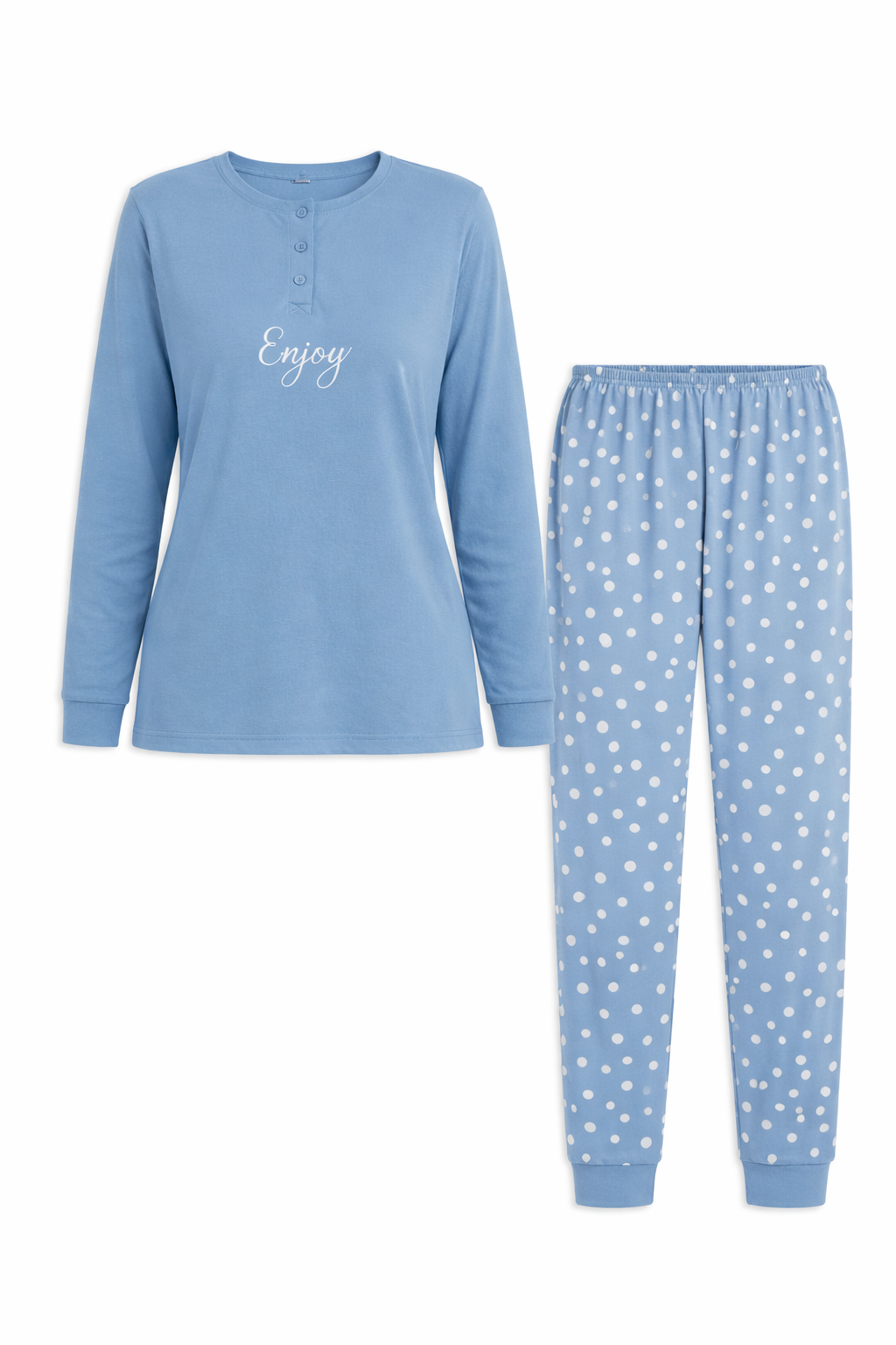 Deze vrolijke Cocodream pyjamaset is perfect voor ontspannen avonden en comfortabele nachten. De set is uitgevoerd in een frisse blauwe kleur en combineert stijl met hoog draagcomfort. De top heeft lange mouwen, een knoopsluiting aan de hals en een sierlijk “Enjoy” borduursel op de borst, wat zorgt voor een vrouwelijke en ontspannen uitstraling.
