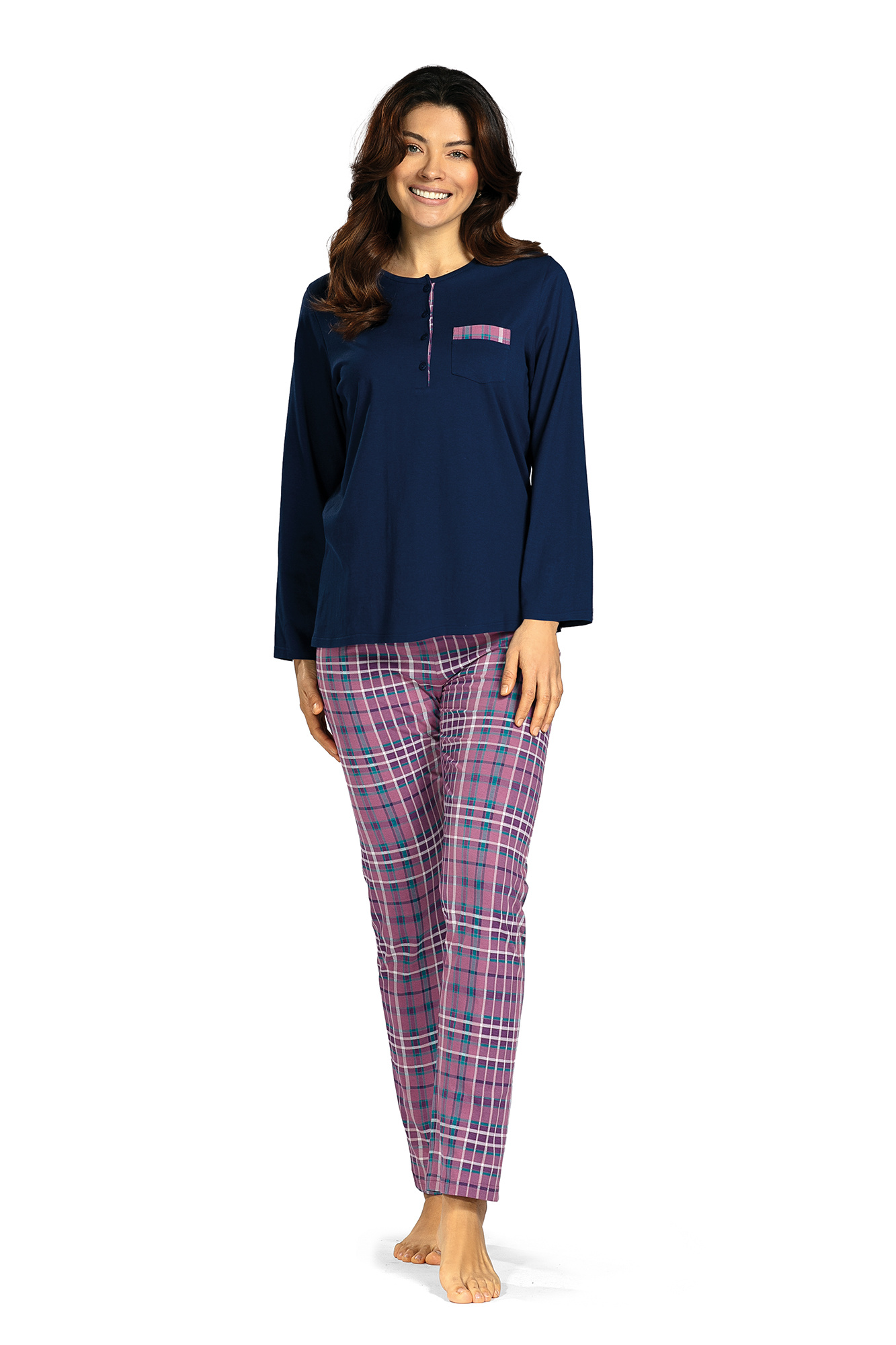 Dames pyjama van Comtessa in een 100% katoenen kwaliteit. De pyjama heeft een donkerblauwe top en een roze geblokte broek. Verkrijgbaar in meerdere maten. Lees meer