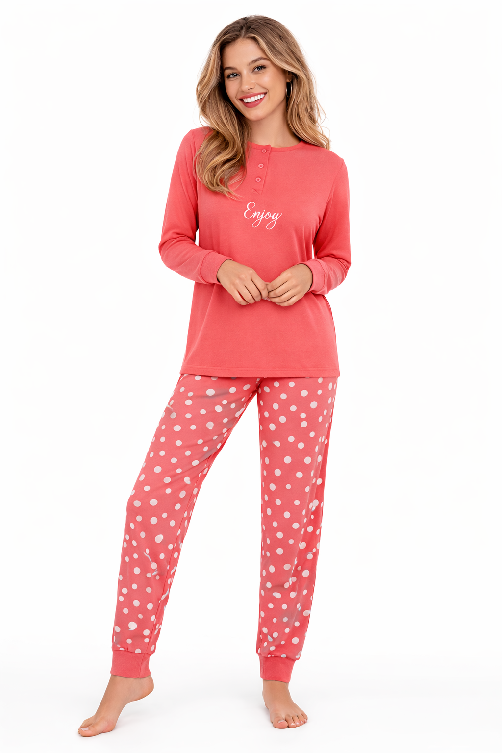 Deze vrolijke Cocodream pyjamaset is perfect voor ontspannen avonden en comfortabele nachten. De set is uitgevoerd in een frisse koraalrode kleur en combineert stijl met hoog draagcomfort. De top heeft lange mouwen, een knoopsluiting aan de hals en een sierlijk “Enjoy” borduursel op de borst, wat zorgt voor een vrouwelijke en ontspannen uitstraling.