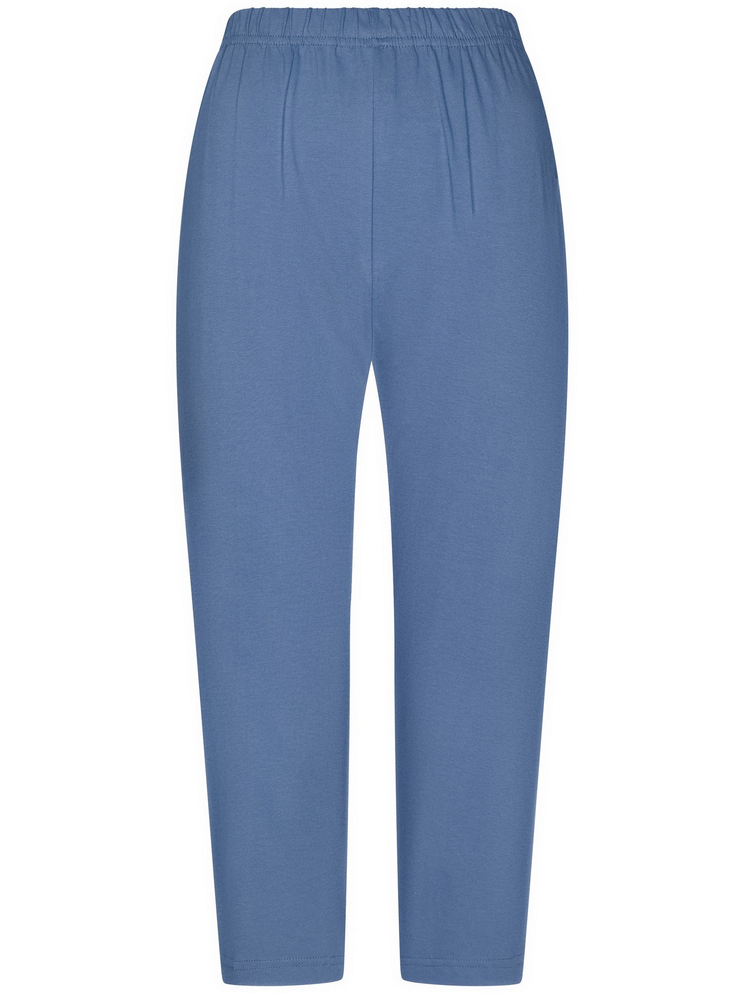 De tweedelige set bestaat uit een top en een driekwart broek. De top is uitgevoerd in een blauw kleur met een wit streepdessin en heeft korte mouwen. De ronde hals is afgewerkt met een knoopsluiting en een leuk detail is het borstzakje. De broek is uni blauw van kleur en heeft een recht model met een elastische tailleband voor een optimale en comfortabele pasvorm.