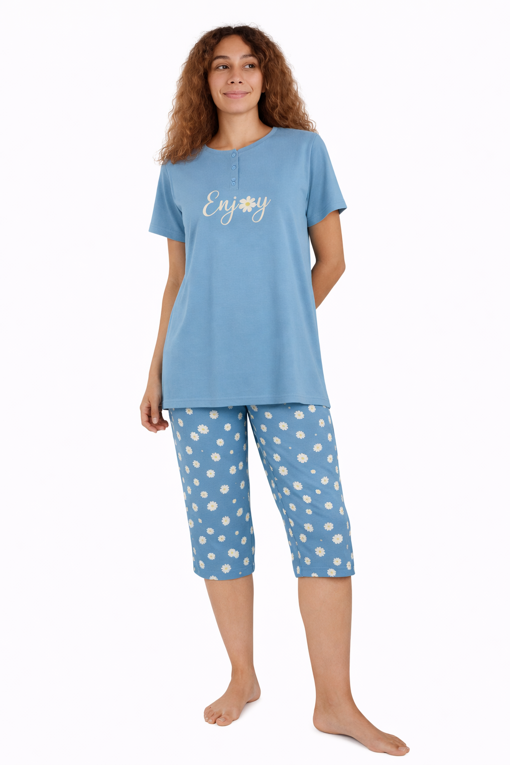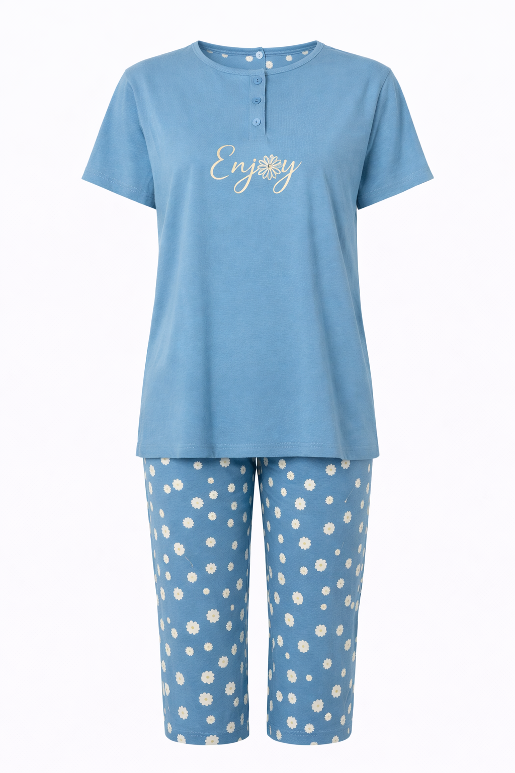 Zomer pyjama voor dames met een 3/4 capri broek. Het shirt is in een blauwe kleur en heeft een ronde hals met 3 knoopjes. De driekwart broek is in een bijpassende kleur met een leuke madeliefjes print.
