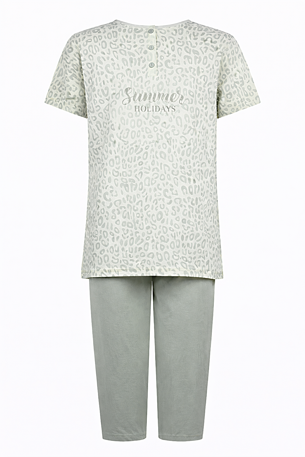 Zomer pyjama voor dames met een 3/4 capri broek. Het shirt is groen in een cheeta print en heeft een ronde hals met 3 knoopjes. De driekwart broek is in een bijpassende effen kleur.