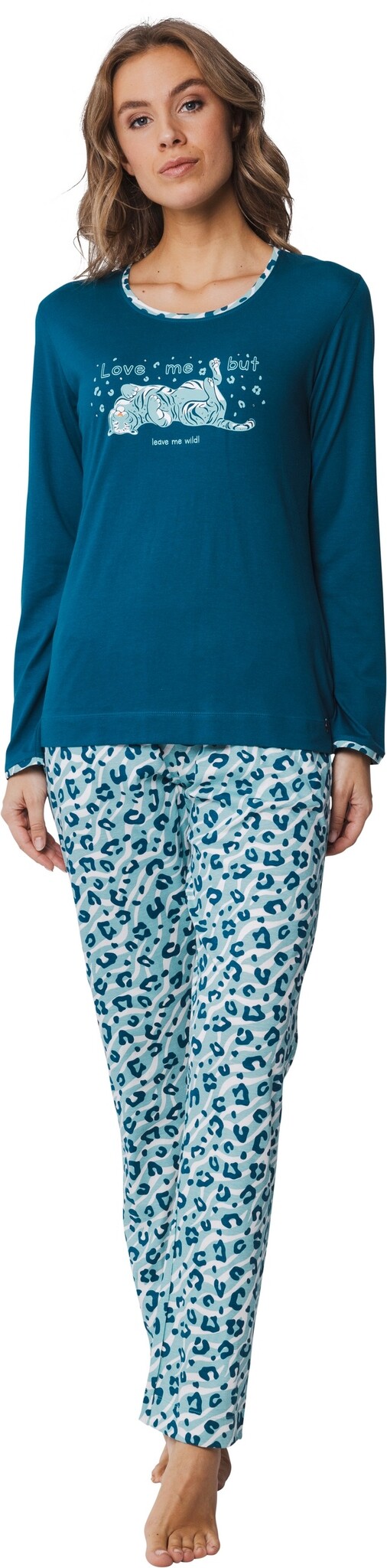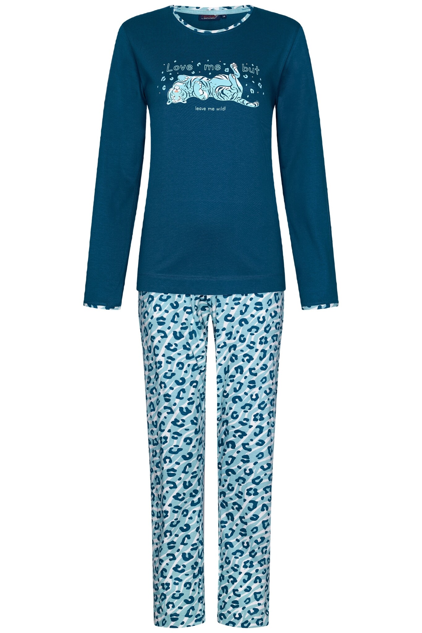 Dames pyjama van het merk Rebelle. Pyjama heeft een mooi groen dessin. Effen top met stoere tijger op de borst afgebeeld. Gedessineerde broek in panter print.