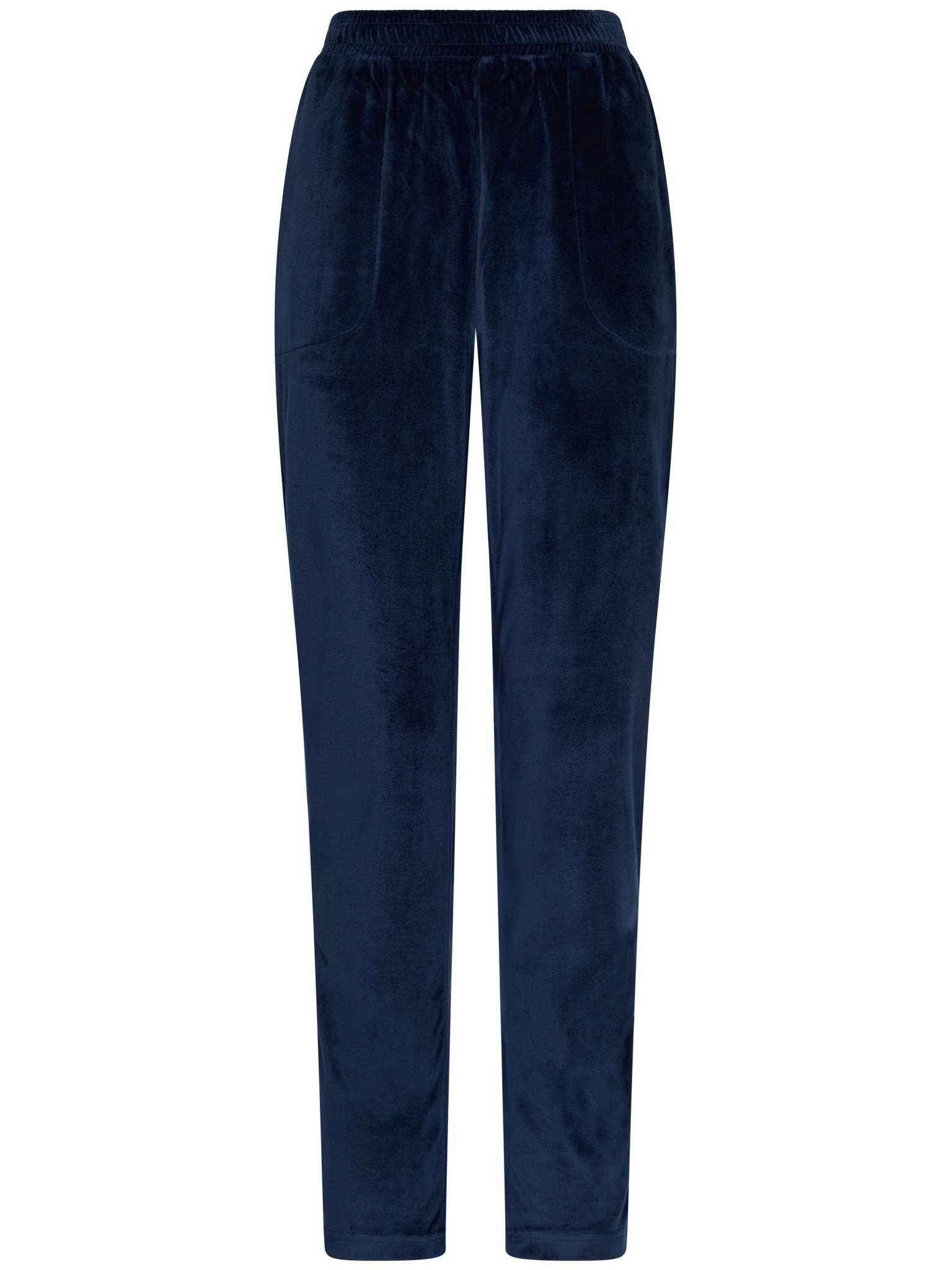 De broek is effen donkerblauw, heeft een elastische tailleband en praktische steekzakken.