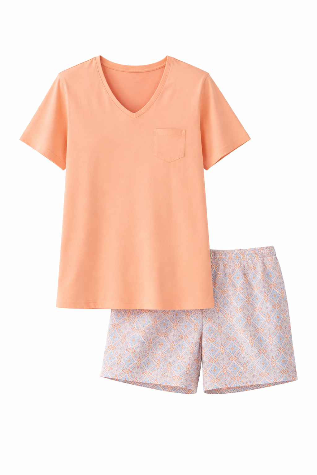 De top is uitgevoerd in een zachte perzikkleur en heeft een elegante V-hals met een subtiel borstzakje, wat zorgt voor een vrouwelijke en stijlvolle uitstraling. De korte broek heeft een speels all-over dessin in zachte tinten en vormt een mooie combinatie met de effen top. Dankzij de comfortabele pasvorm en de elastische tailleband zit de broek prettig en biedt deze voldoende bewegingsvrijheid.