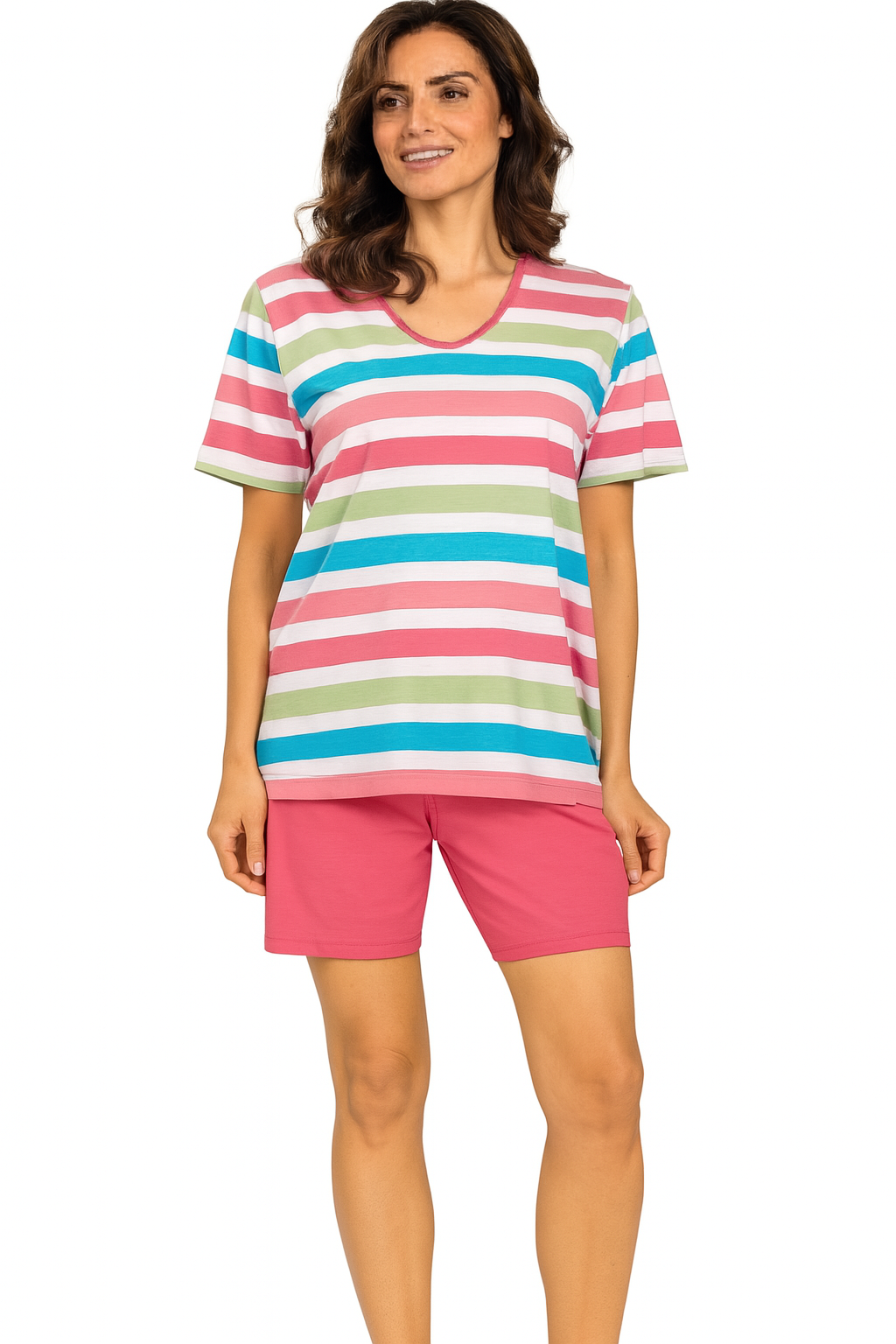 Dames pyjama met korte broek van Comtessa in een katoenen kwaliteit. Leuk gestreept zomerss dessin.. Verkrijgbaar in meerdere maten. Lees meer