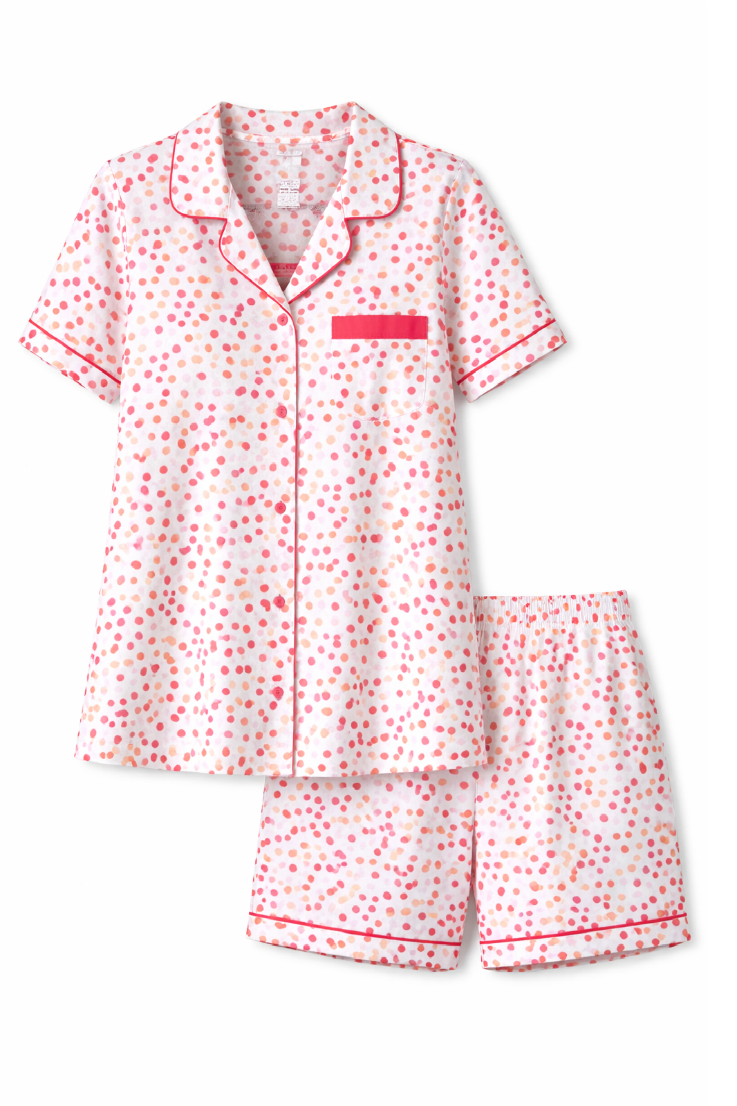 De top heeft een klassieke doorknoopsluiting met kraag, wat zorgt voor een elegante en tijdloze uitstraling. De contrastbies langs de kraag, mouwen en borstzak geeft de shortama een extra verzorgd detail. Het borstzakje op de borst maakt het geheel compleet. De korte broek heeft een elastische tailleband en dezelfde speelse stippenprint, waardoor de set een frisse en zomerse look krijgt.