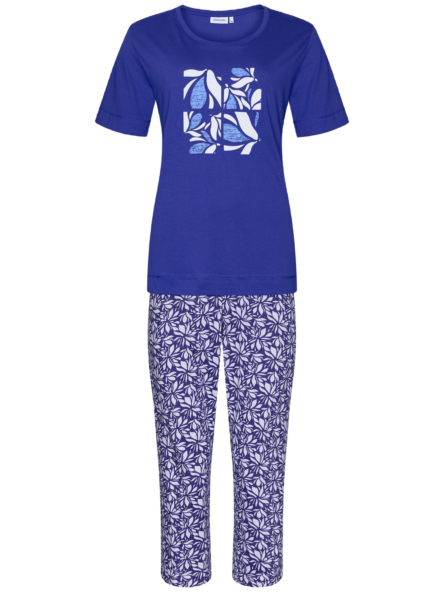 Pastunette dames pyjama met een 3/4 capri broek. De pyjama heeft een blauwe kleur. Gemaakt van 100% biologisch katoen. Lees meer