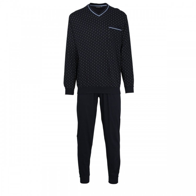 Pyjama heeft een donkerblauwe kleur met een modern dessin. Pyjama heeft boordjes aan de mouwen en broekspijpen en een v-hals.