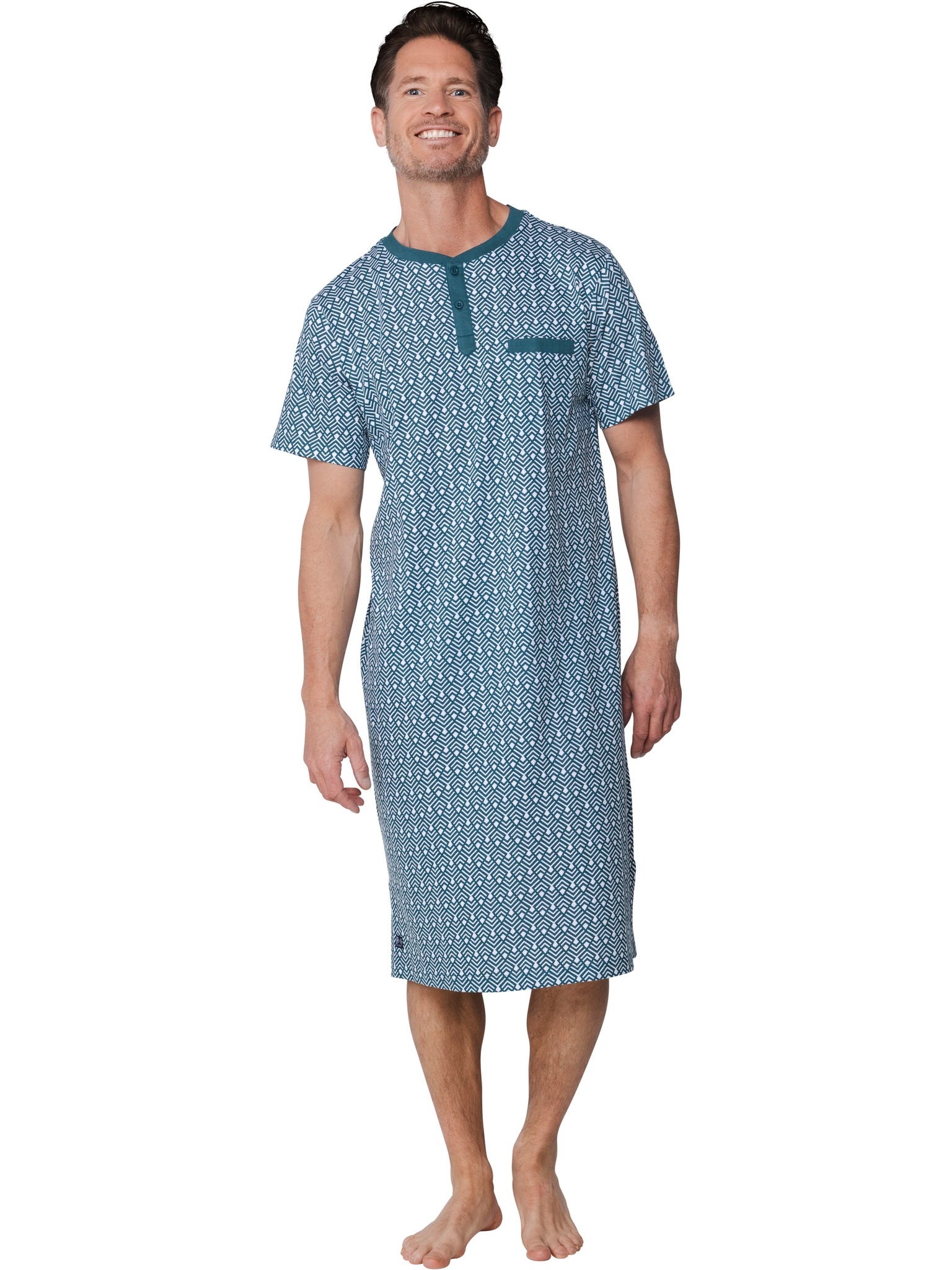 Dit comfortabele heren nachthemd uit de Green Motion serie van Pastunette combineert een tijdloze uitstraling met optimaal draagcomfort. Het nachthemd is uitgevoerd in een donkergroene kleur met een allover graphic print in wit, wat zorgt voor een moderne en sportieve uitstraling.