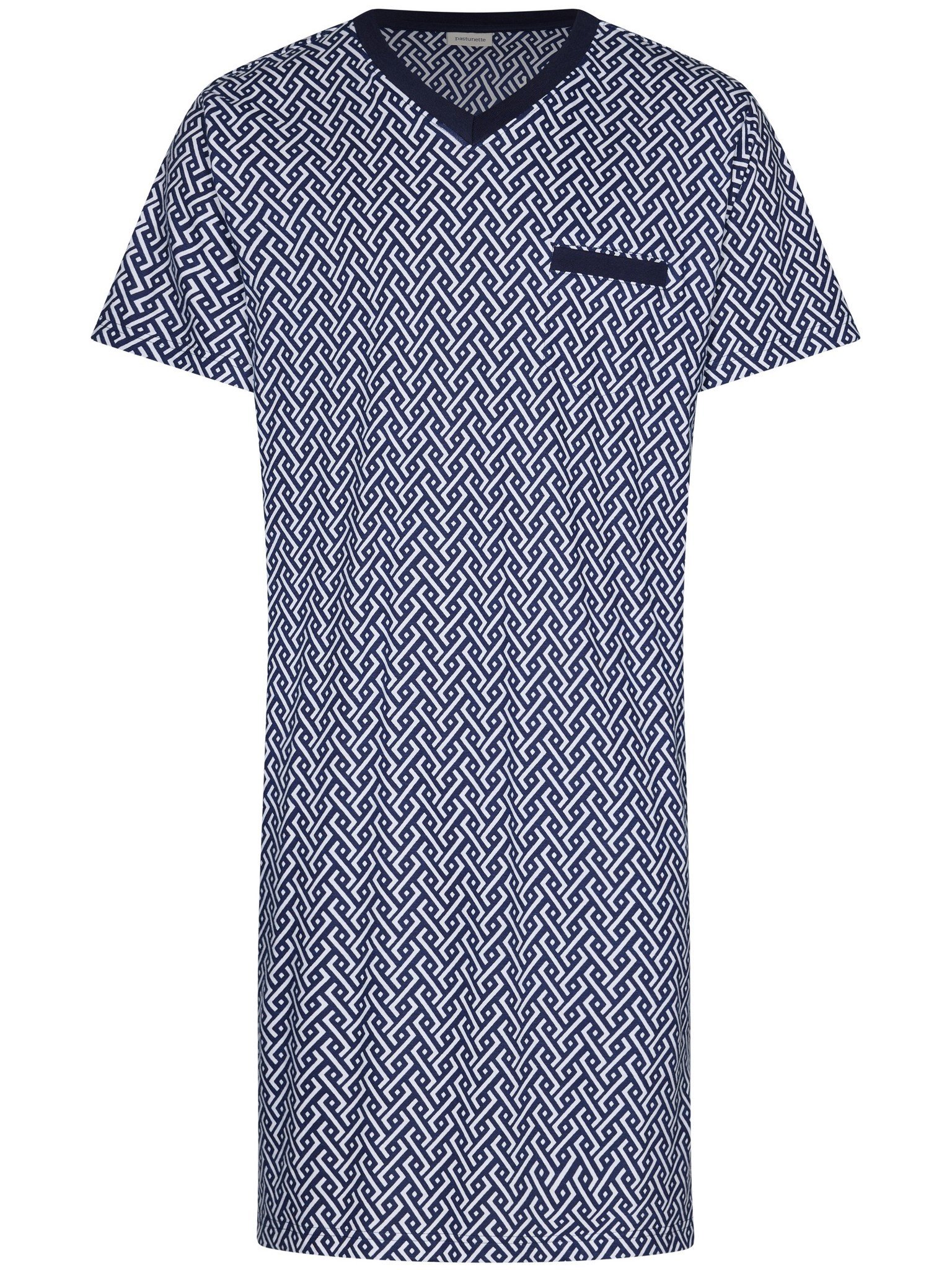 Dit mooie nachtshirt komt uit de Blue Motion serie van Pastunette. Het is donkerblauw van kleur en heeft een all-over grafische print in wit. Het nachtshirt heeft korte mouwen, een V-hals en een borstzakje. Lees meer