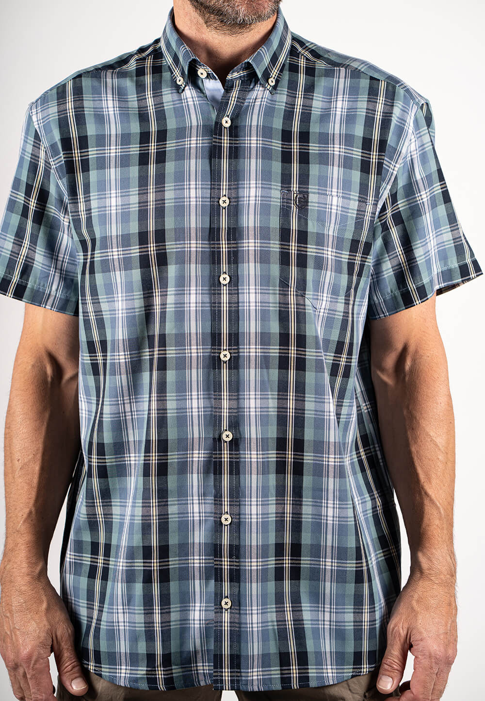 Heren overhemd korte mouw - blauw groen geruit - strijkvrij