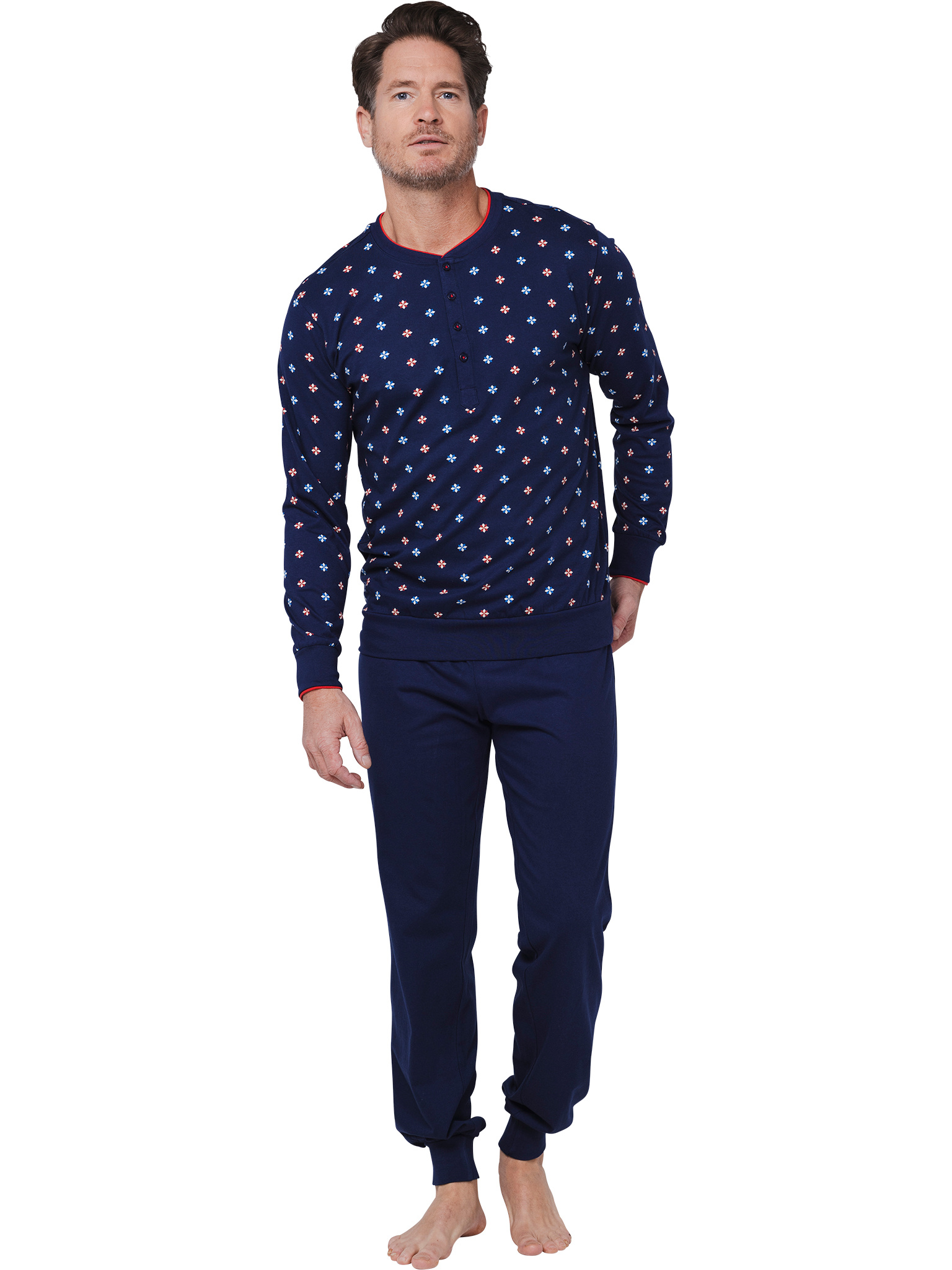Heren pyjama van het merk Pastunette in een leuke blauwe allover print. Boorden aan de mouwen en broekspijpen voor extra draagcomfort. De pyjama is verkrijgbaar in meerdere maten. Gemaakt van 100% biologisch katoen.