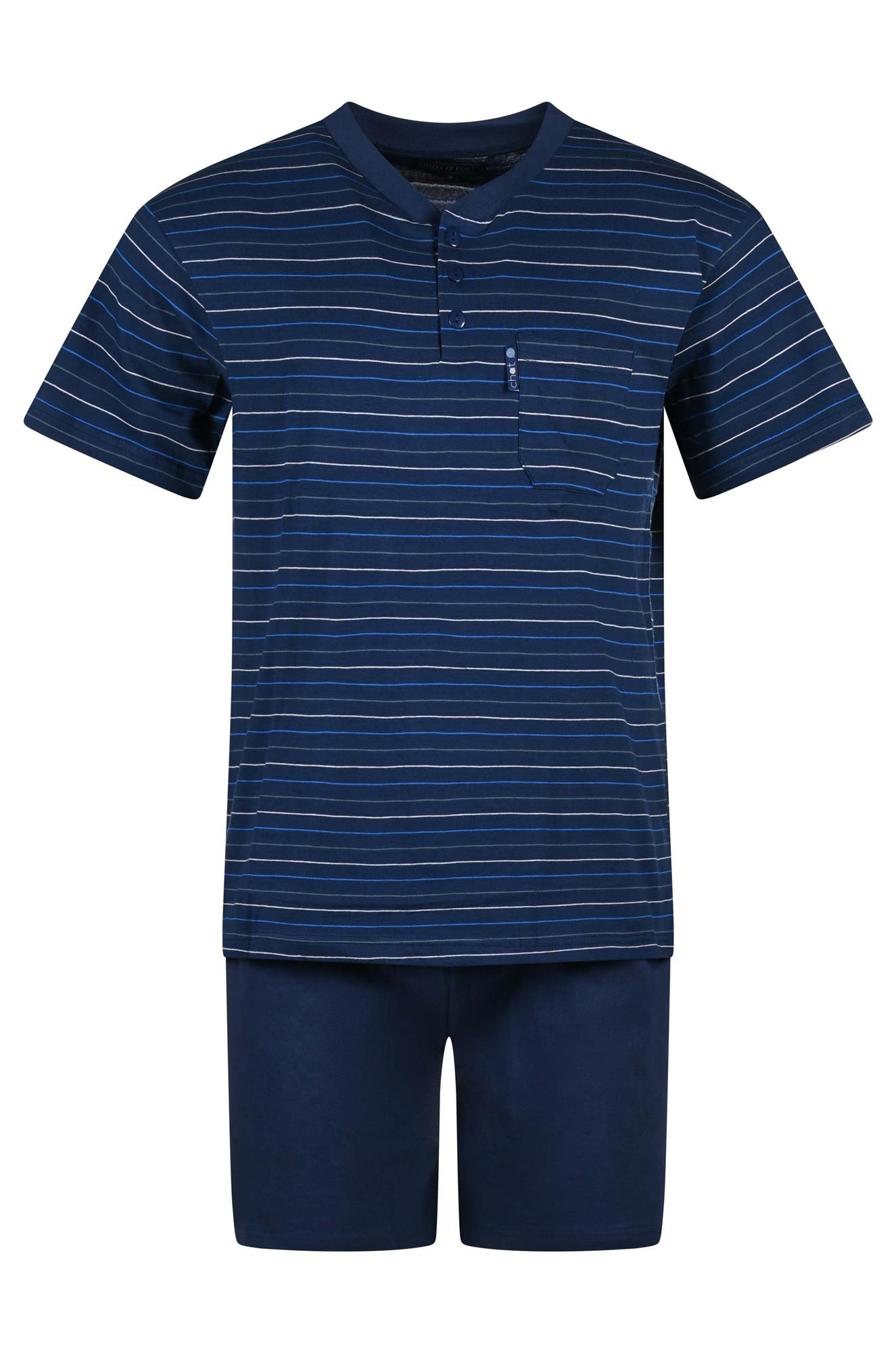 Blauwe korte heren pyjama van het merk Outfitter. Gemaakt van 100% katoen. Lees meer