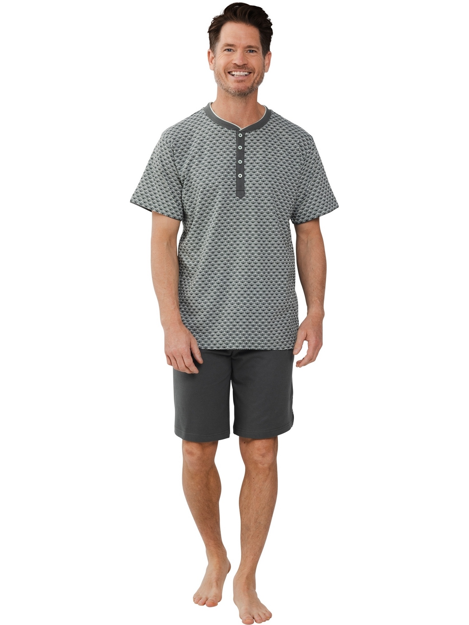 Heren shortama van het merk Pastunette. De korte heren pyjama heeft een leuke print in een groene kleur. Ronde hals met vier knoopjes.