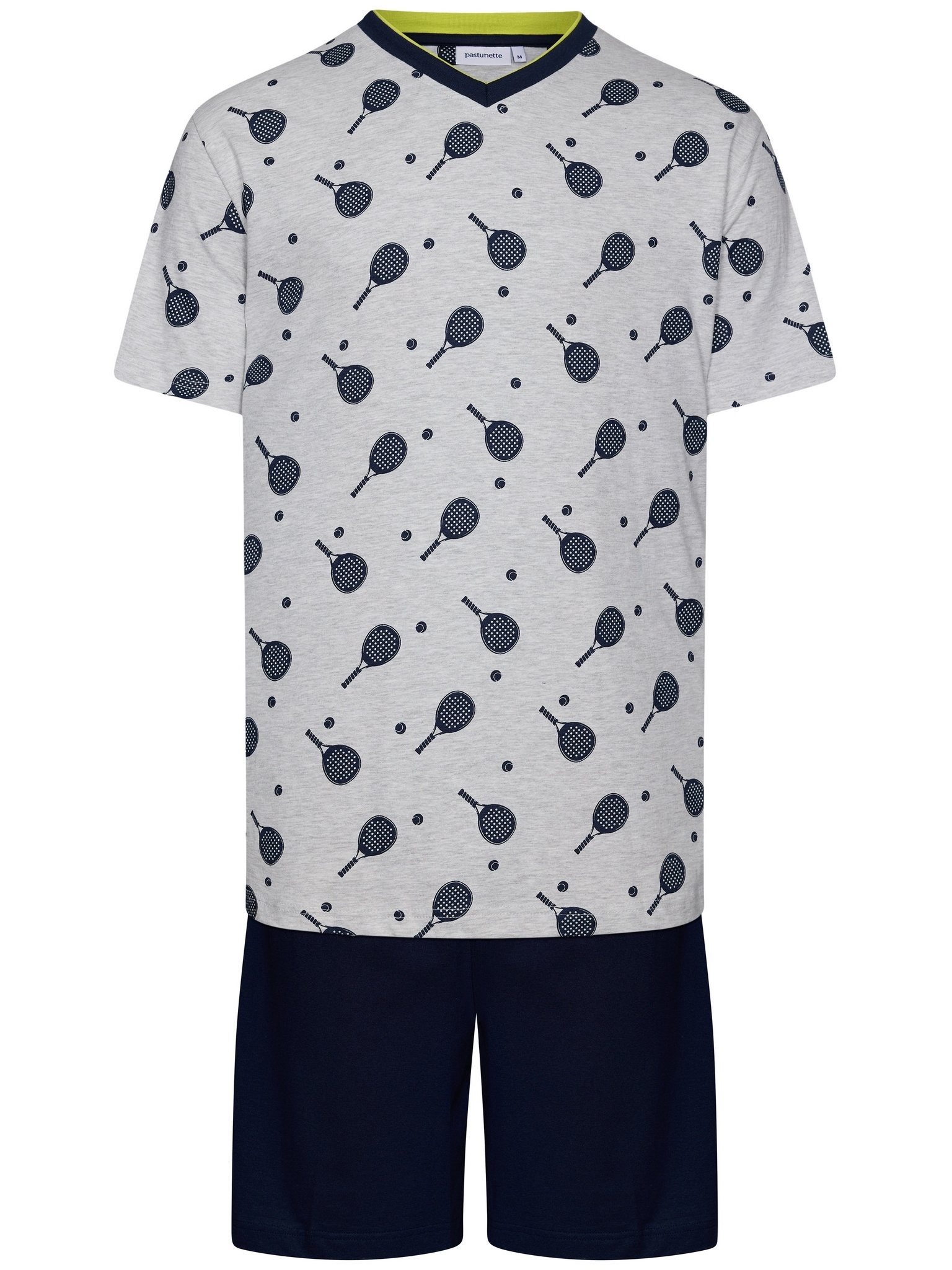 De shortama heeft een stijlvolle combinatie van grijs en donkerblauw en is voorzien van een speels padelracket-dessin. De top heeft korte mouwen en een V-hals met een subtiele ribafwerking. Het bijpassende korte broekje valt ruim boven de knie en heeft een comfortabele elastische tailleband.