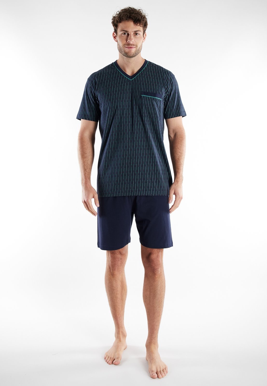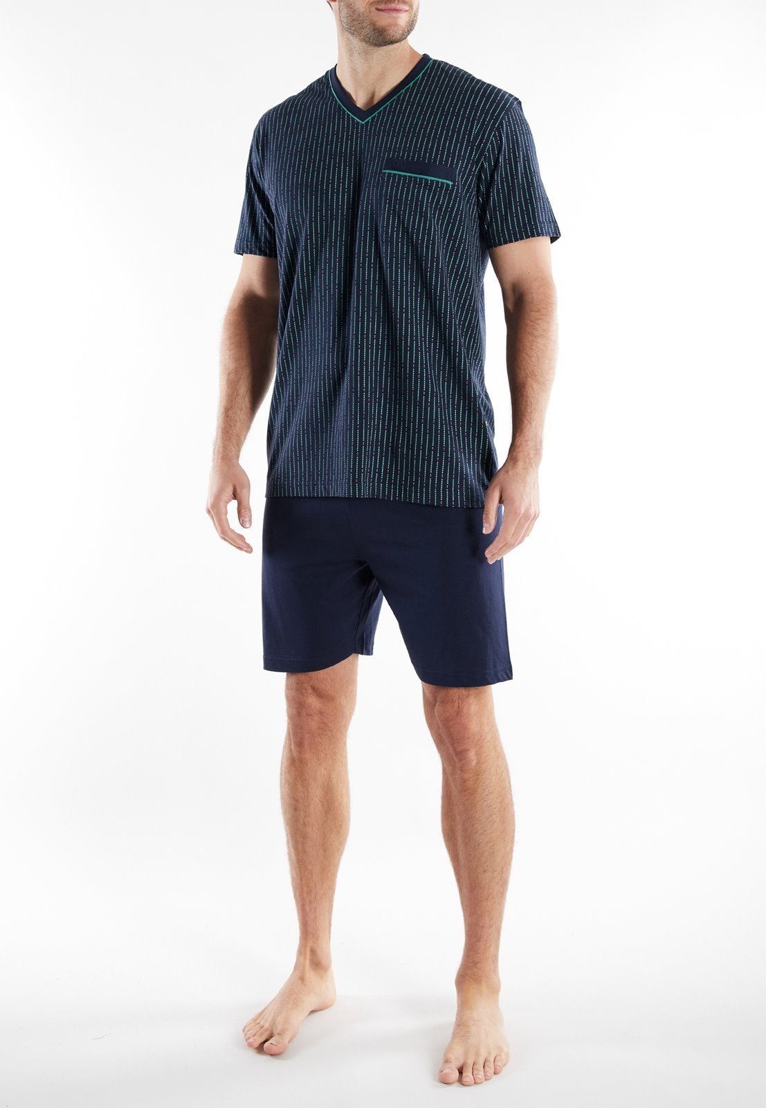 De donkerblauwe top heeft een moderne V-hals en is voorzien van een subtiel verticaal streeppatroon in frisse accenten, wat zorgt voor een luxe en verzorgde uitstraling. De borstzak geeft het geheel een praktische en stijlvolle touch. De bijpassende korte broek in effen donkerblauw maakt de set compleet en zorgt voor een rustige, tijdloze look.