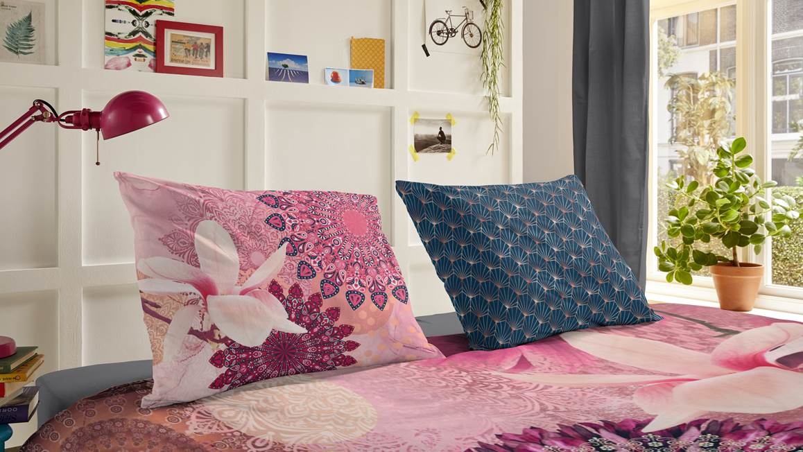 Het kleurrijke dessin bestaat uit een combinatie van mandala’s en bloemen in diverse roze en paarstinten. Hierdoor creëer je een warme uitstraling met een romantische look. De achterzijde van het overtrek heeft een mooi, grafisch dessin in donkerblauw die zorgt voor een mooie omslag.