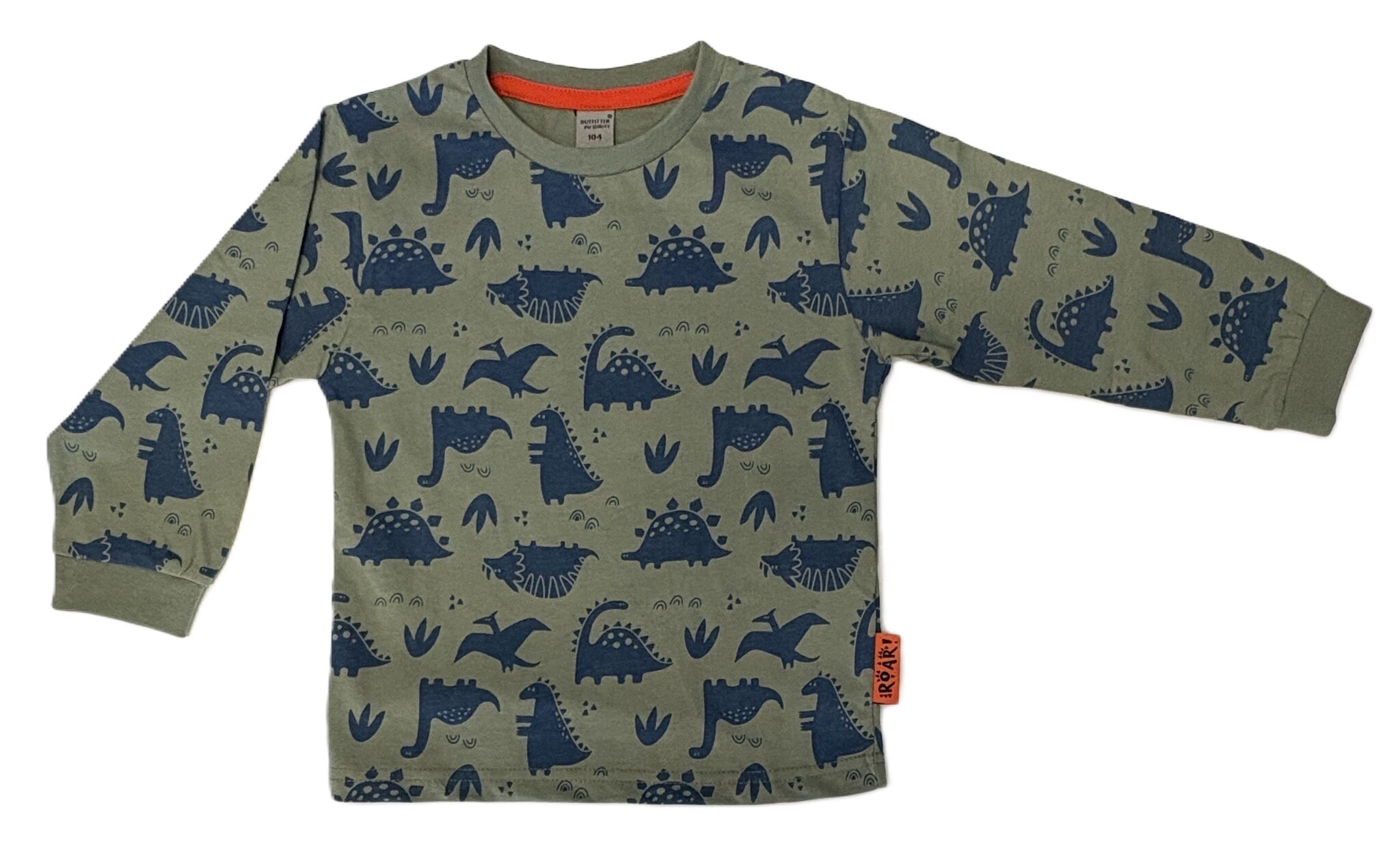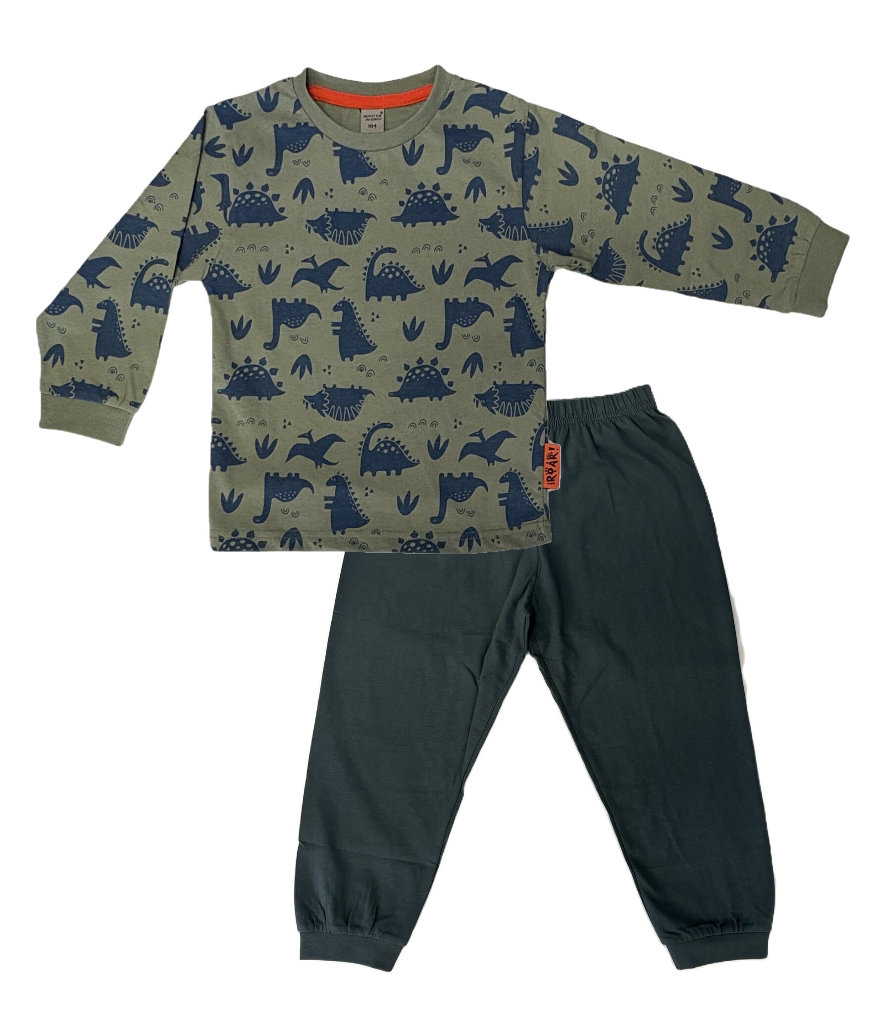 Stoere jongens pyjama met dinoprint in de kleur groen. Boordjes aan de mouwen en broekspijpen voor extra draagcomfort.