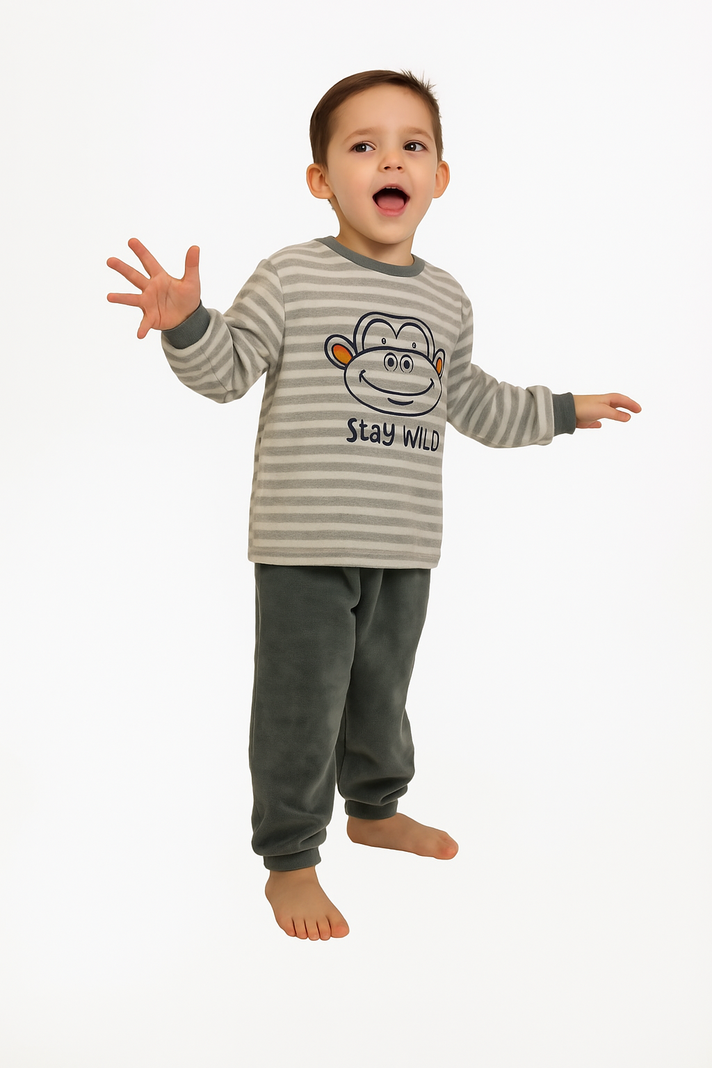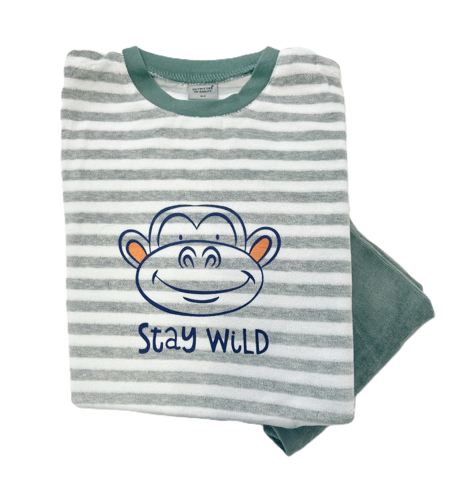 Warme velours pyjama voor jongens. De top is grijs wit gestreept en heeft een opdruk van een aap. De broek is donkergroen. Gemaakt van 75% katoen en 25% polyester.