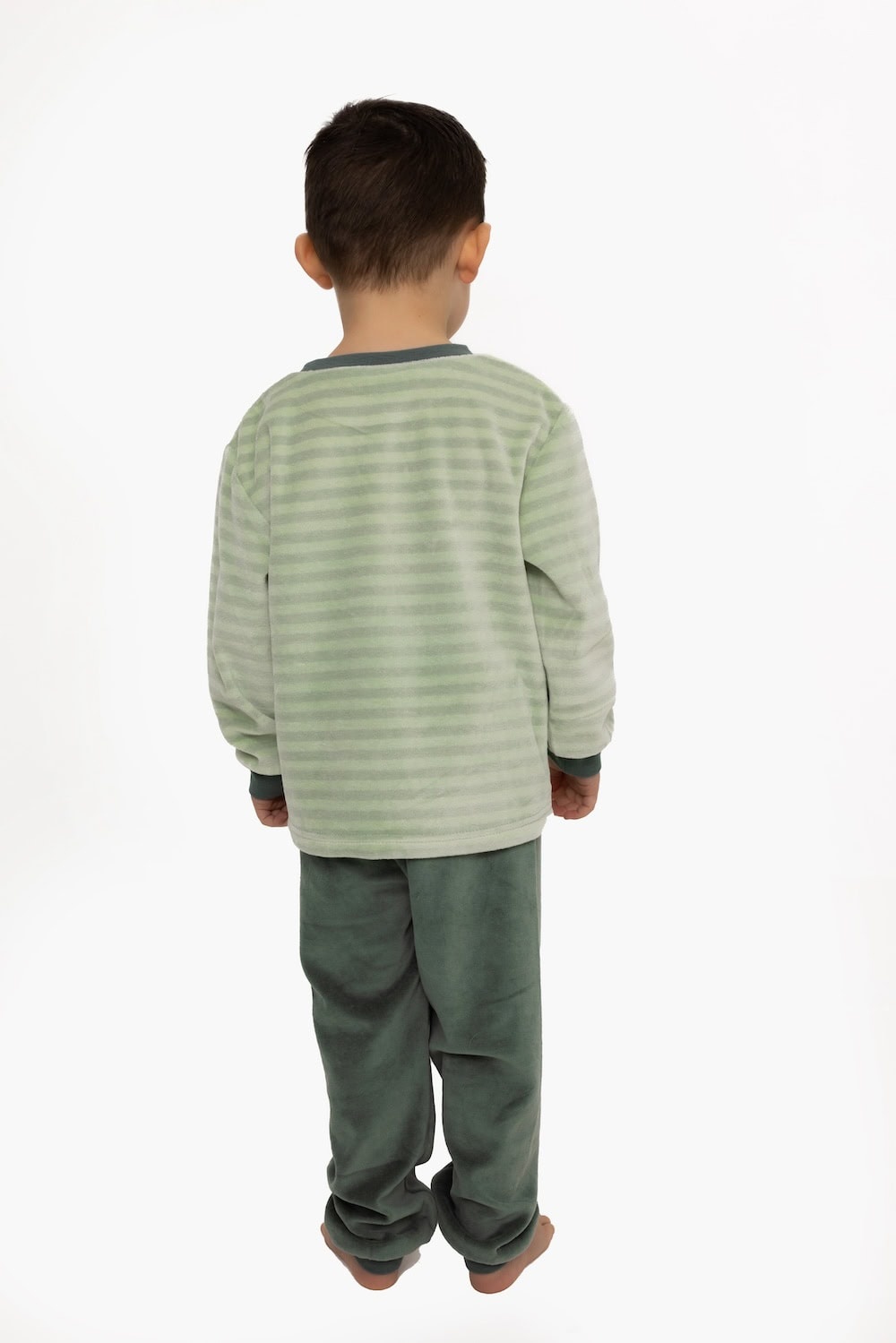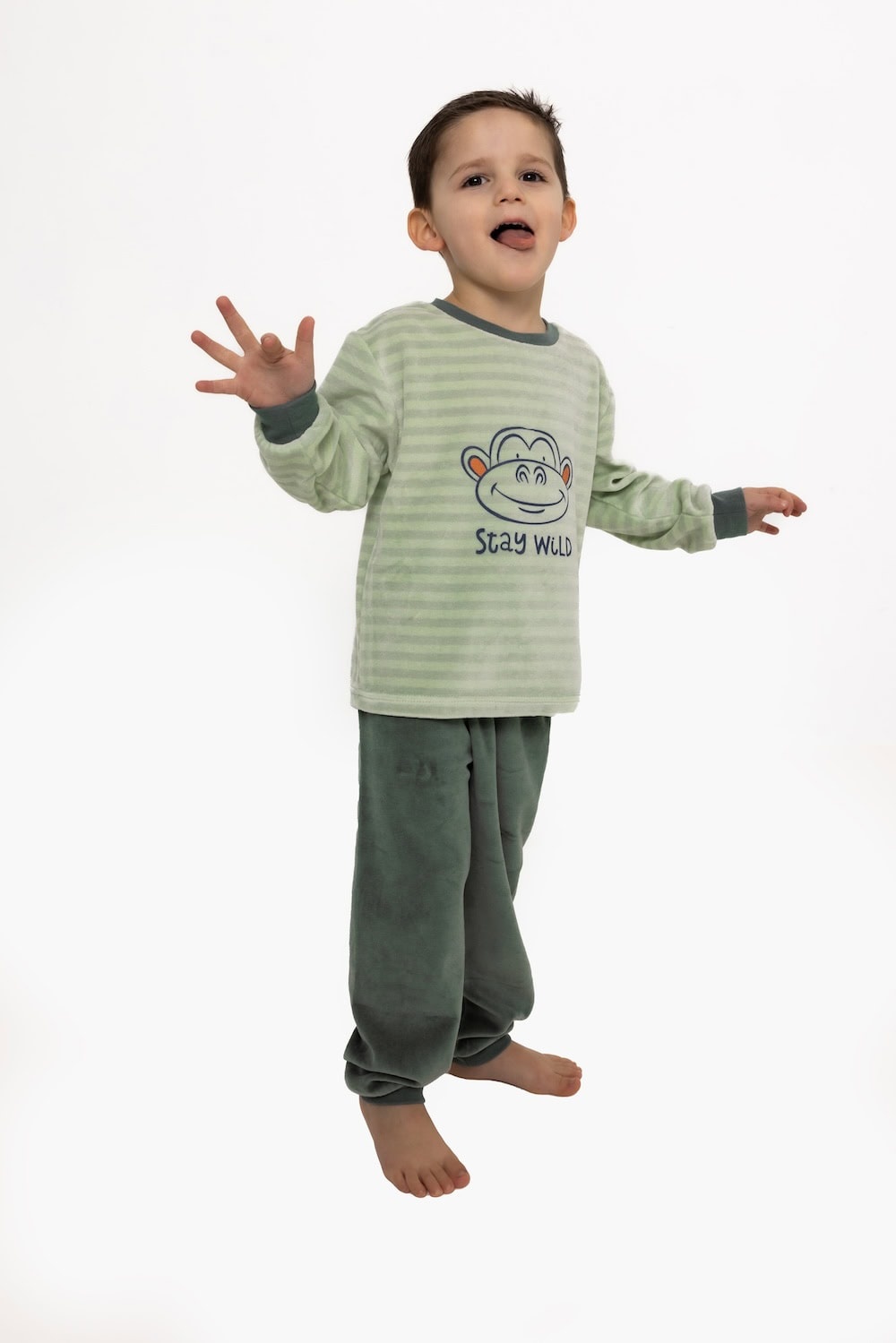 Warme velours pyjama voor jongens in de kleur groen. De top is gestreept en heeft een opdruk van een aap. De broek is donkergroen.