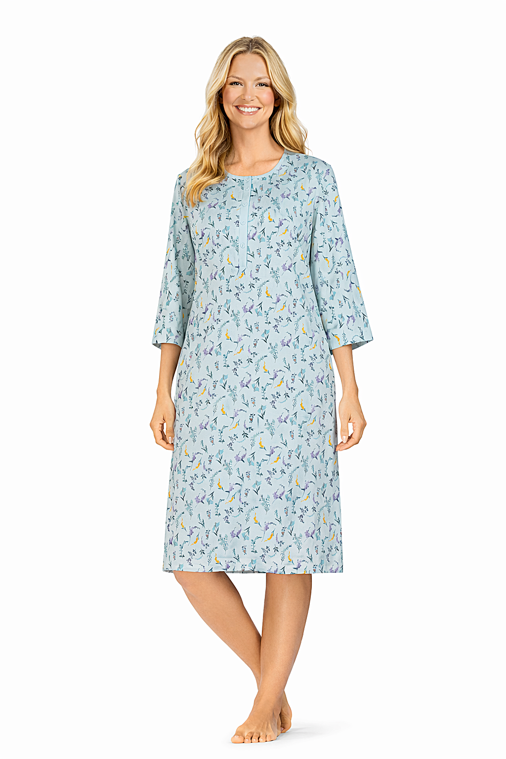 Het nachthemd heeft een mooi all-over bloemendessin dat zorgt voor een frisse en vrouwelijke uitstraling. De 3/4 mouwen bieden extra comfort en maken dit model geschikt voor meerdere seizoenen. De knoopsluiting met vier knoopjes geeft het nachthemd een klassieke en praktische afwerking.