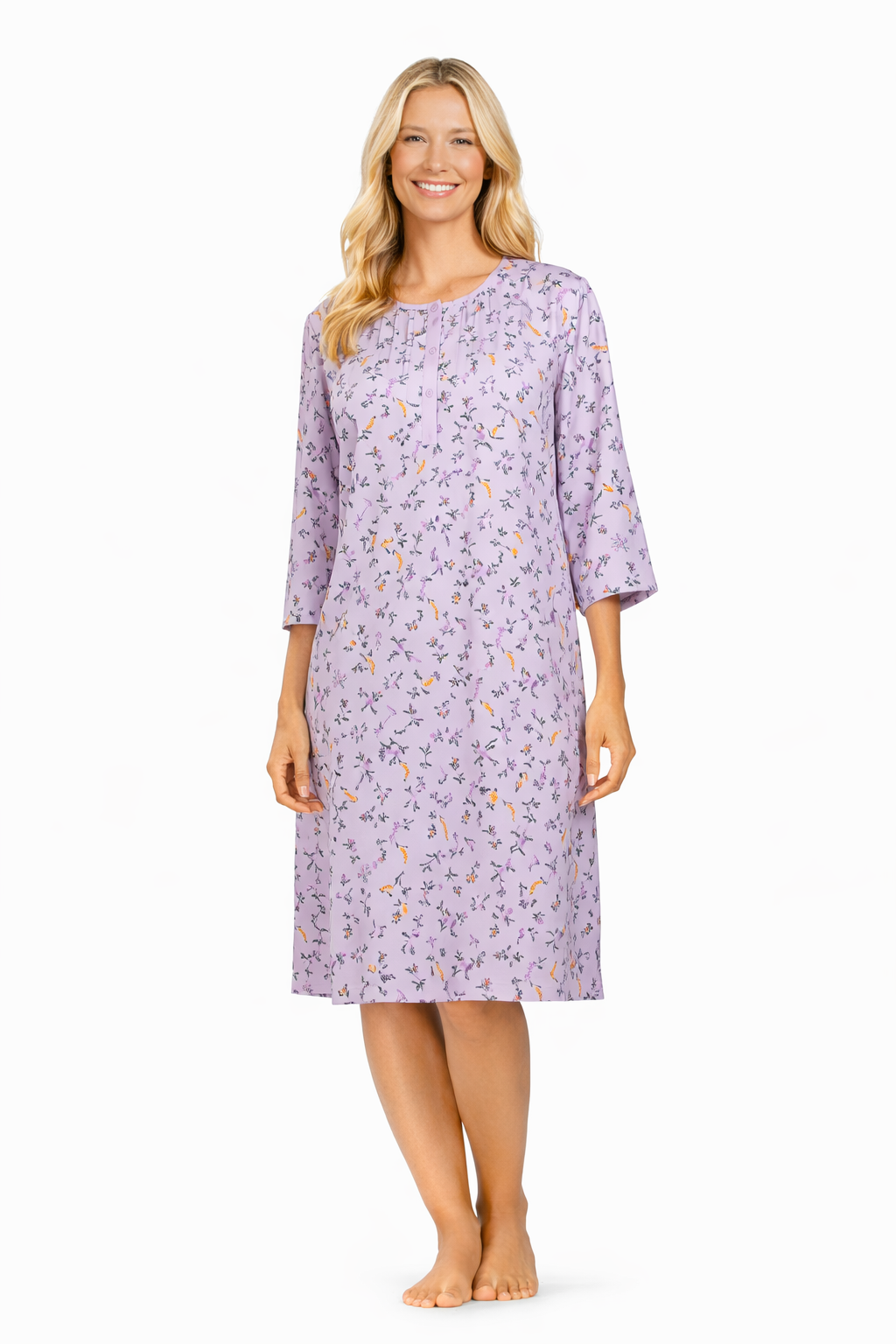 Het nachthemd heeft een mooi all-over bloemendessin dat zorgt voor een frisse en vrouwelijke uitstraling. De 3/4 mouwen bieden extra comfort en maken dit model geschikt voor meerdere seizoenen. De knoopsluiting met vier knoopjes geeft het nachthemd een klassieke en praktische afwerking.