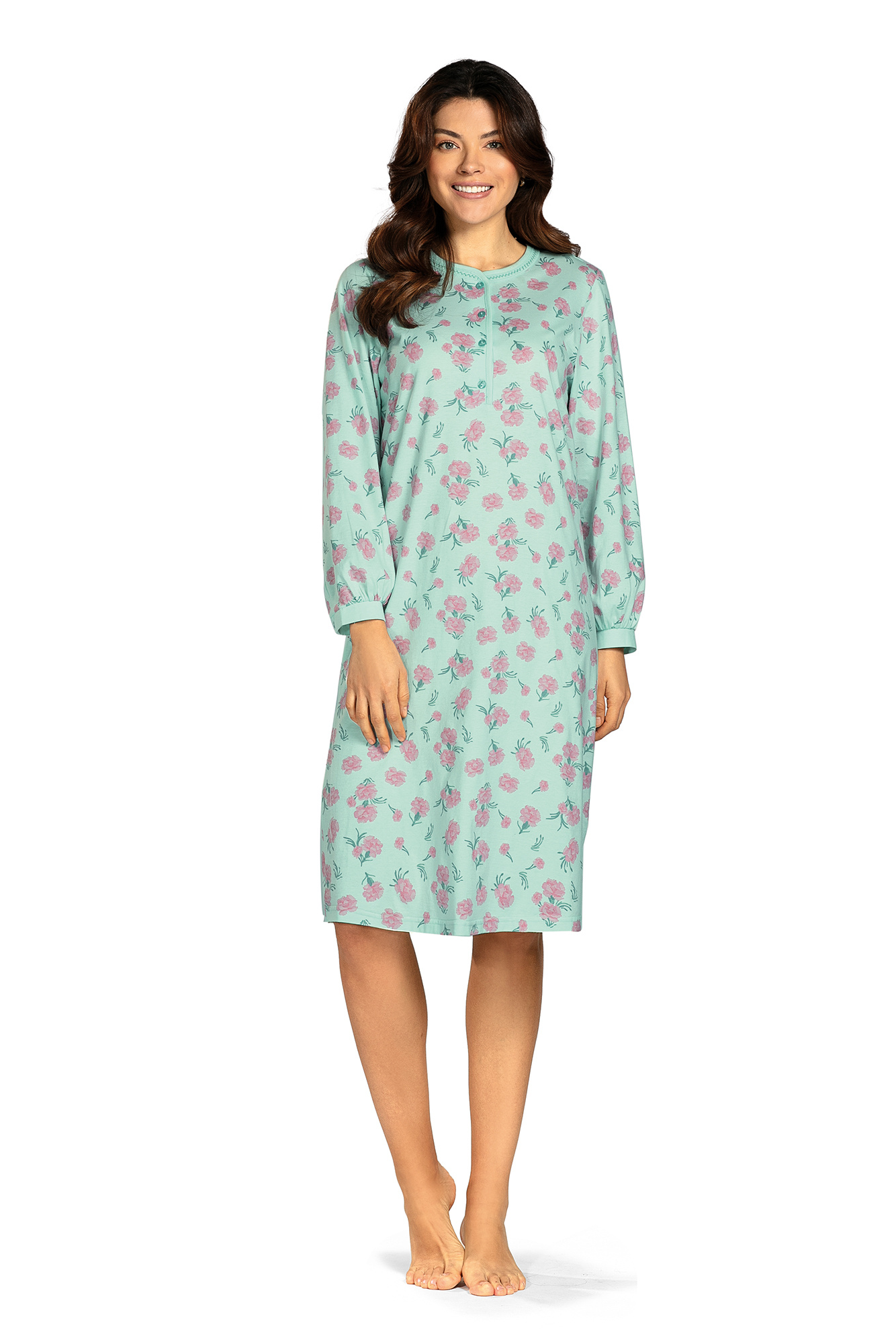Klassiek dames nachthemd van Comtessa in een katoenen kwaliteit. Mooi fris gebloemd dessin met knoopsluiting (4 knoopjes). Het nachthemd heeft lange mouwen.