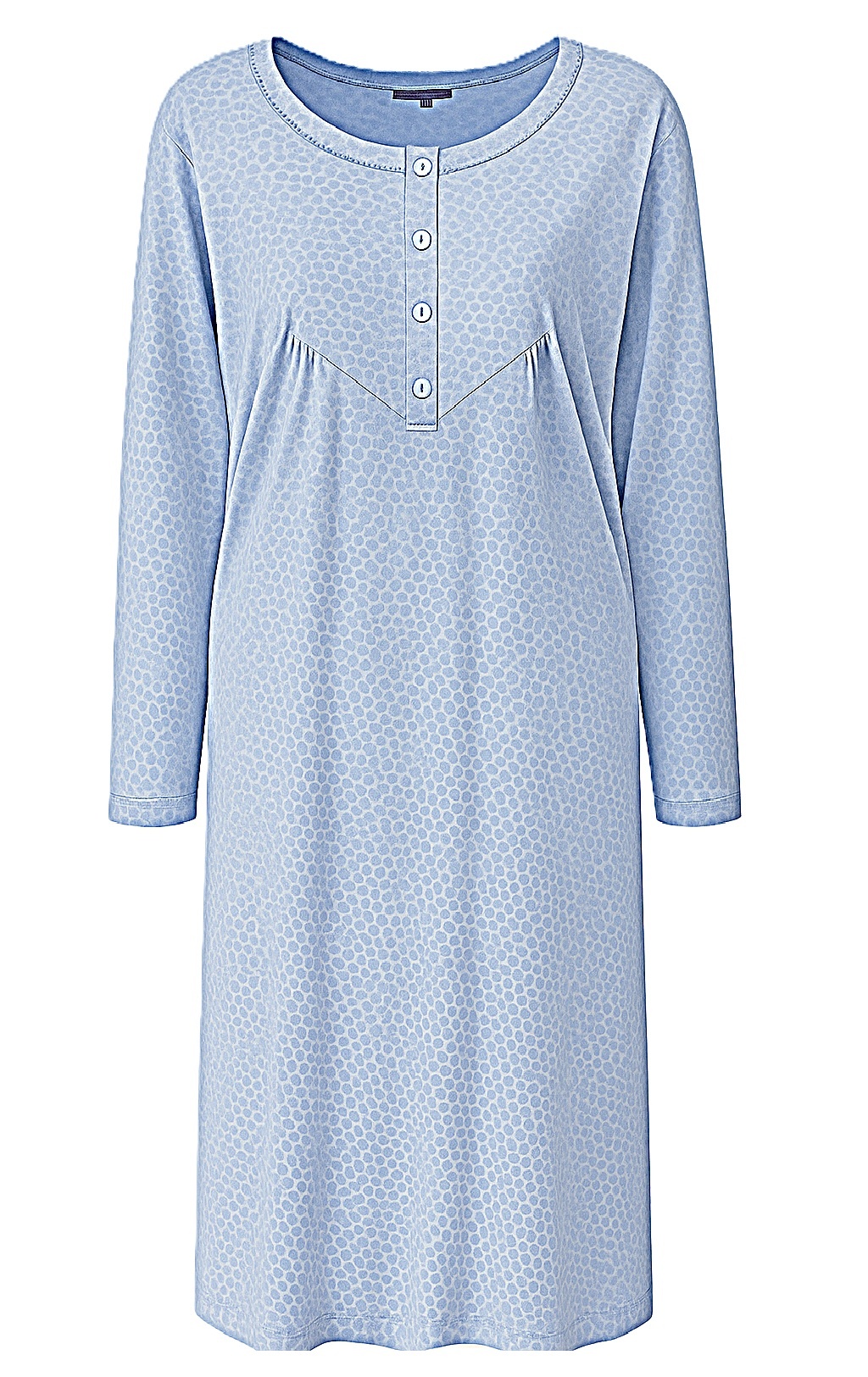 Het nachthemd heeft een ruim klassiek model en een lengte van ca. 115 cm, waardoor het extra bedekking en comfort geeft. De lange mouwen zorgen voor warmte en een comfortabele pasvorm, terwijl de ronde hals met 4 knoopjes zorgt voor een praktische en vrouwelijke afwerking. Het stijlvolle allover dessin geeft het nachthemd een frisse en klassieke uitstraling, zonder te druk te zijn.