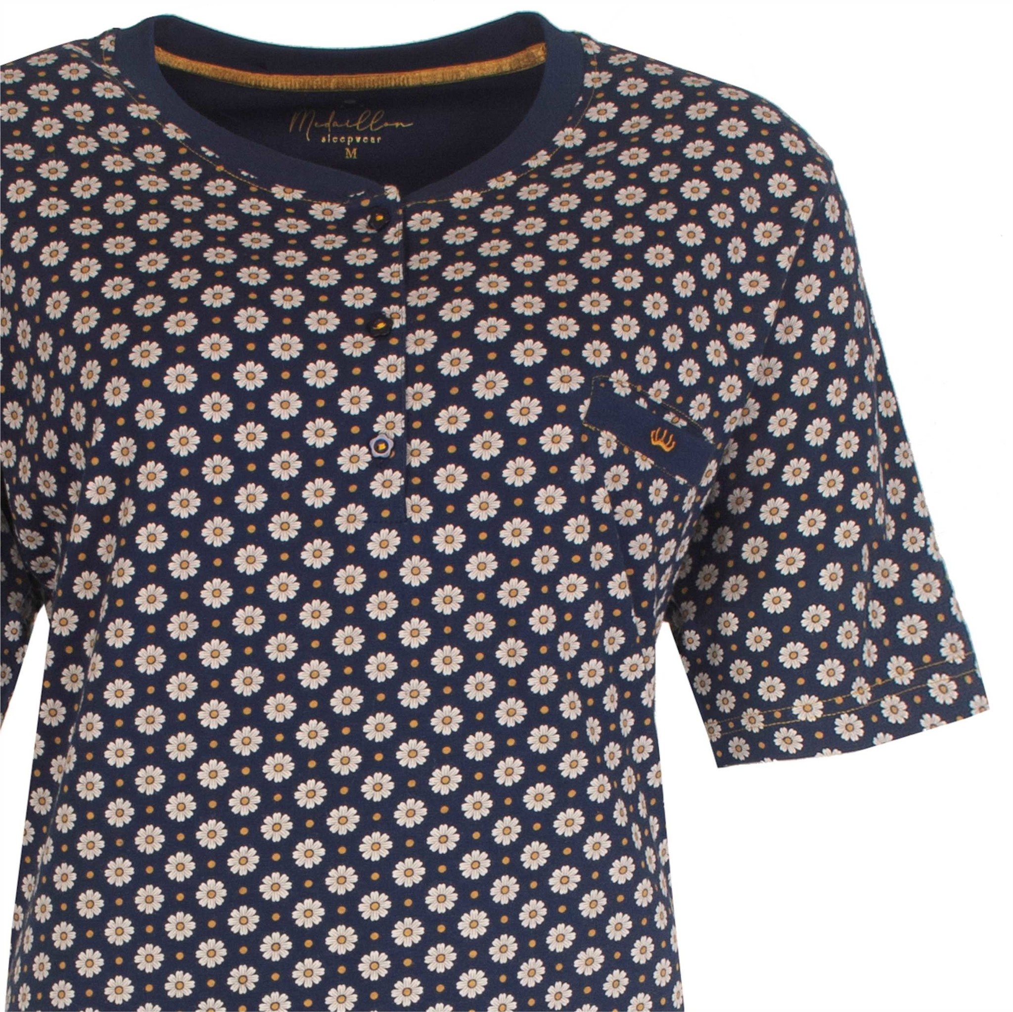 Medaillon Dames Nachthemd gemaakt van 100 % gekamde Katoen. Dit nachthemd is gemaakt in een draagbare en rekbare jersey kwaliteit. Geprint in een bloemen dessin. De ronde hals loopt over in een polo sluiting en knoopje. Korte mouwen. Borstzakje met een geborduurd logo op de borst. Hals boord met elasthan voor meer draagcomfort.