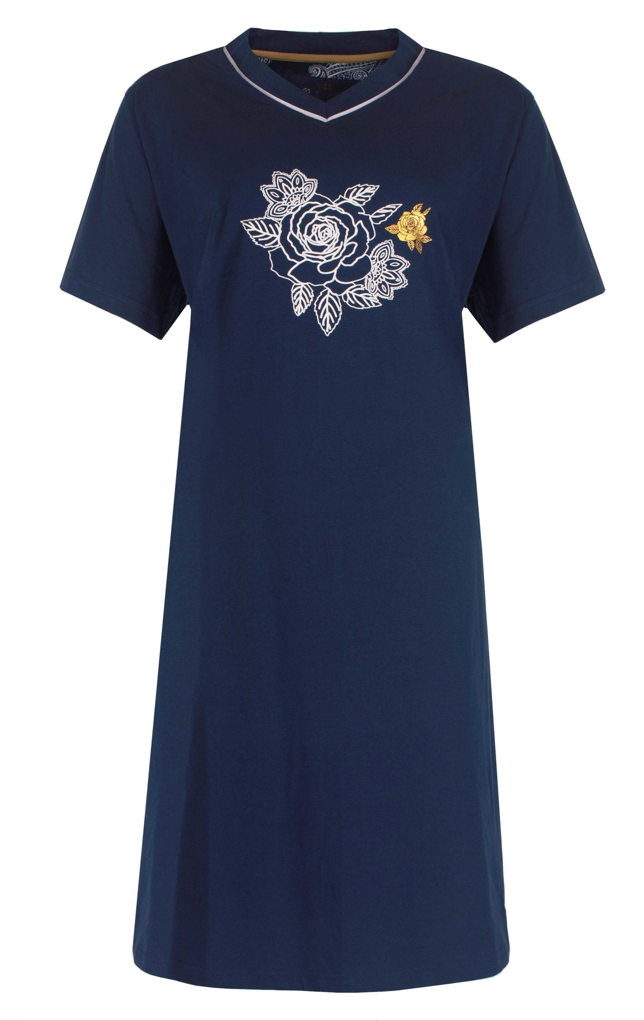 Medaillon Dames Nachthemd gemaakt van 100 % gekamde Katoen. Dit nachthemd is gemaakt in een draagbare en rekbare jersey kwaliteit. Het unie nachthemd heeft en V hals afgewerkt met een biesje. Geprint paisley dessin in de achterhals. Op de borst een bloemen print. Korte mouwen. Hals boordje met elasthan voor meer draagcomfort.