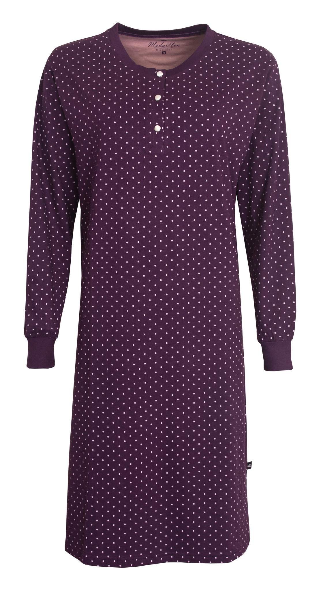 Medaillon dames nachthemd in een gestipt dessin. Nachthemd heeft een donker paarse kleur.