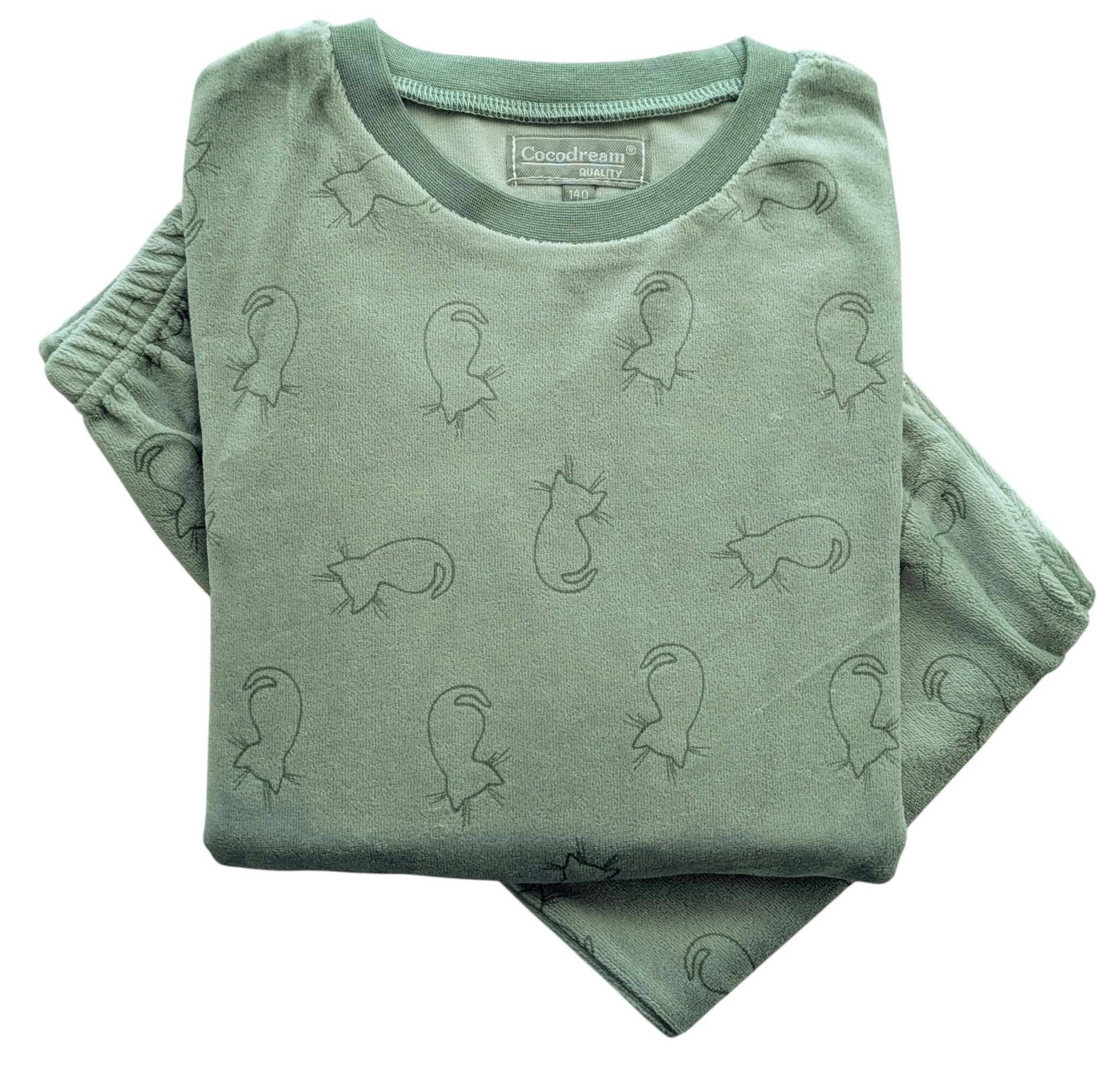 Warme velours pyjama voor meisjes met katjes print in de kleur groen. Gemaakt van 75% katoen en 25% polyester. Lees meer