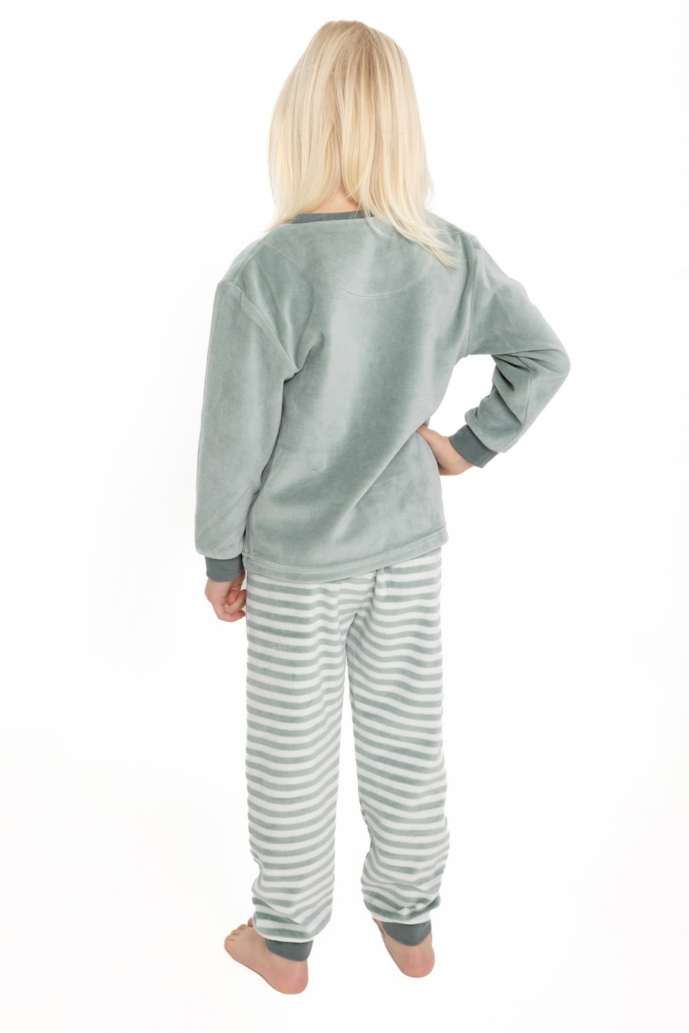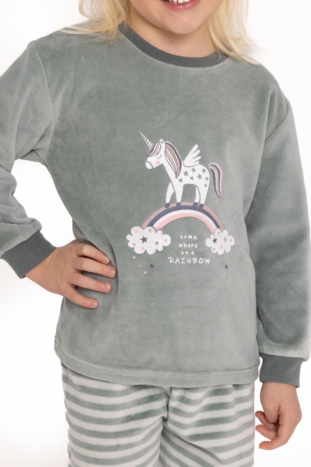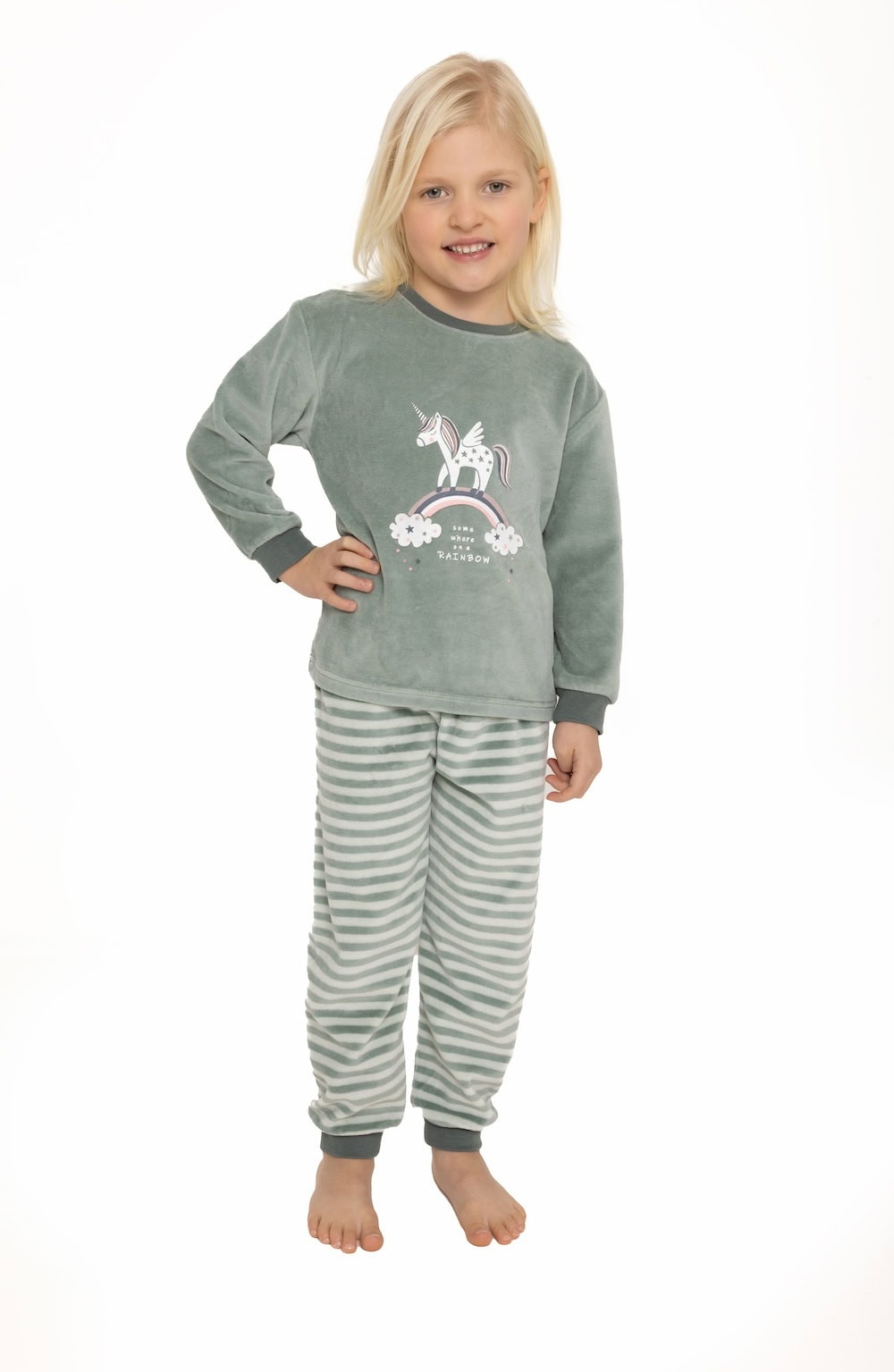 Warme velours pyjama voor meisjes in de kleur groen. De top heeft een opdruk van een unicorn en de broek is gestreept. Gemaakt van 75% katoen en 25% polyester. Lees meer