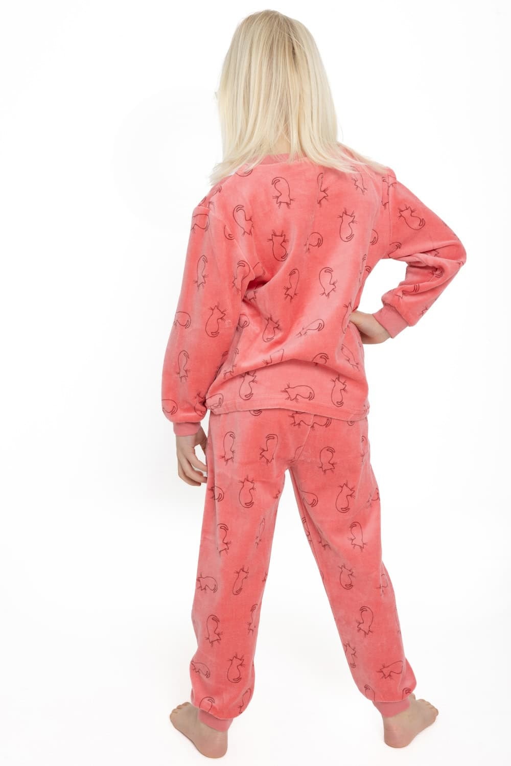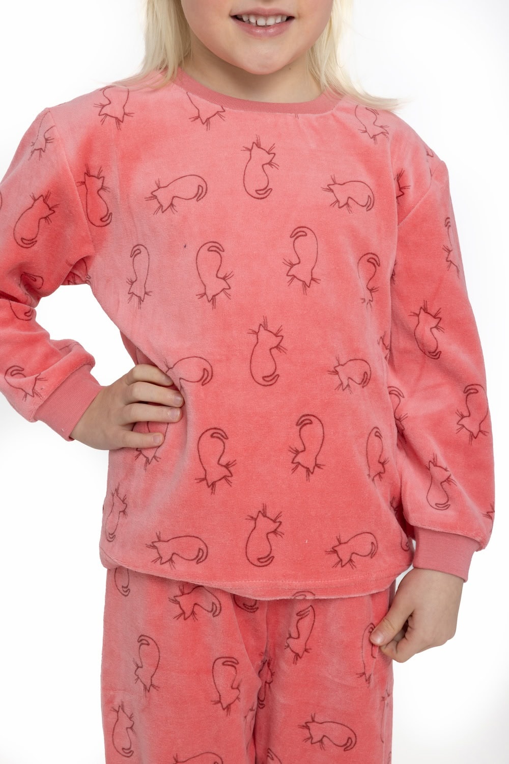 Warme velours pyjama voor meisjes met katjes print in de kleur roze. Gemaakt van 75% katoen en 25% polyester. Lees meer