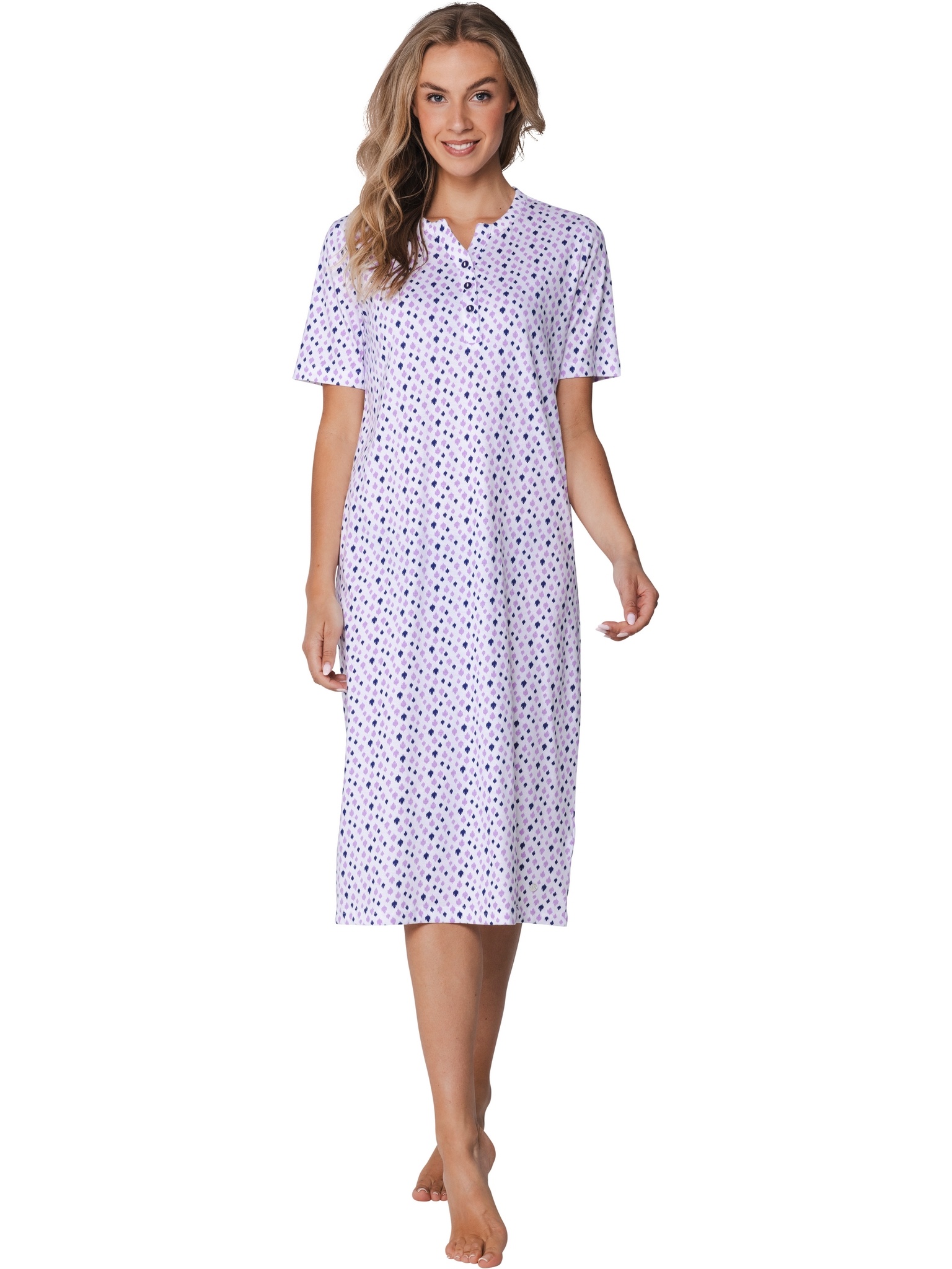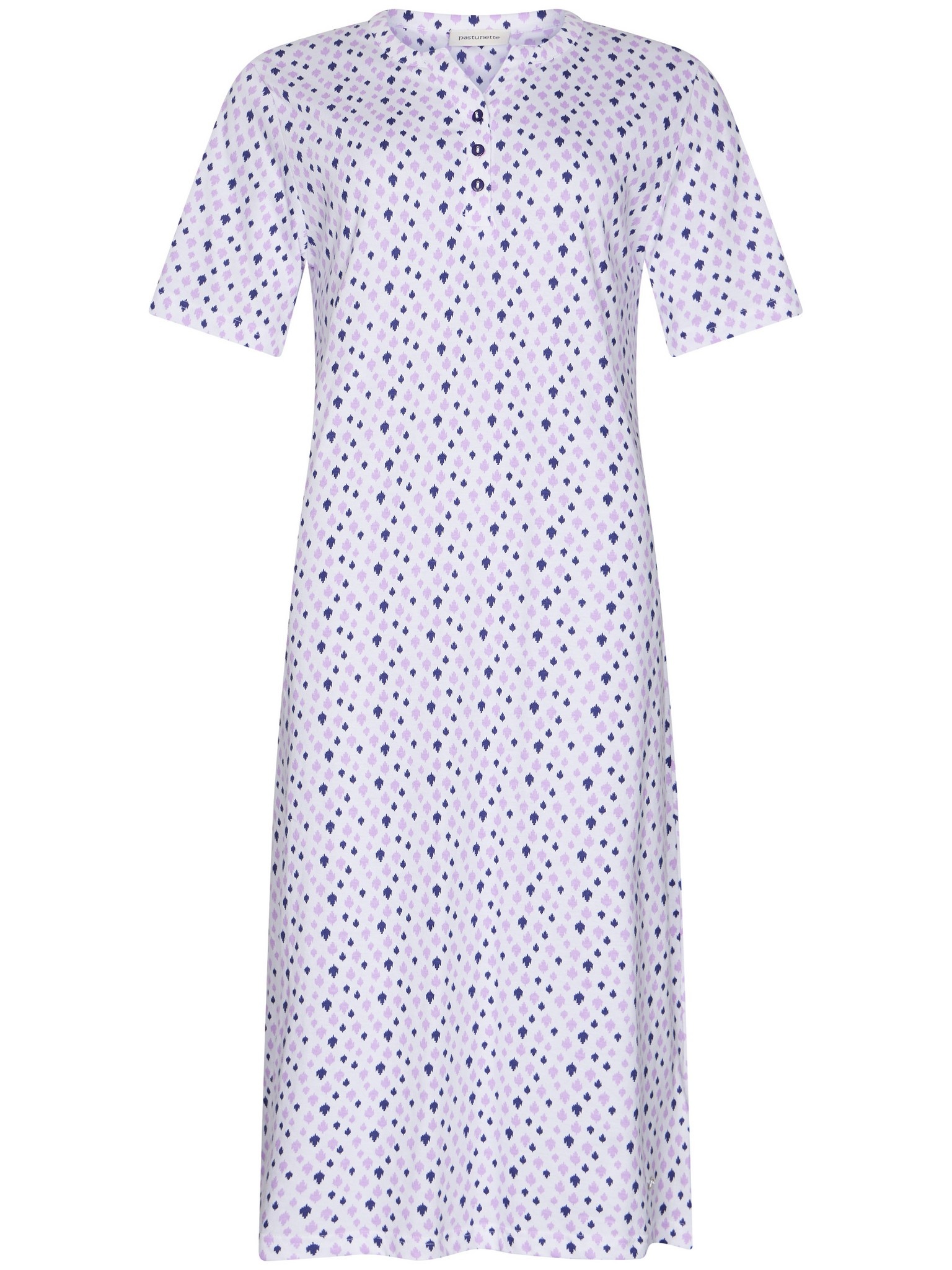 Het nachthemd is uitgevoerd in een witte kleur en heeft een grafisch dessin in paarse tinten, wat zorgt voor een frisse en moderne uitstraling. Het model heeft korte mouwen en een ronde hals met knoopsluiting, wat het nachthemd extra praktisch en comfortabel maakt.